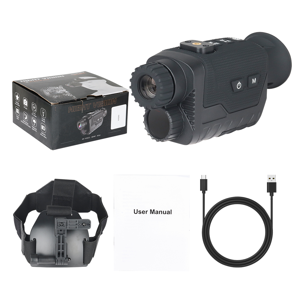 Package Included: - 1 x Night vision - 1 x USB cable - 1 x User manual - 1 x Lanyard - 1 x Cloth bag - 1 x Head mount bracket