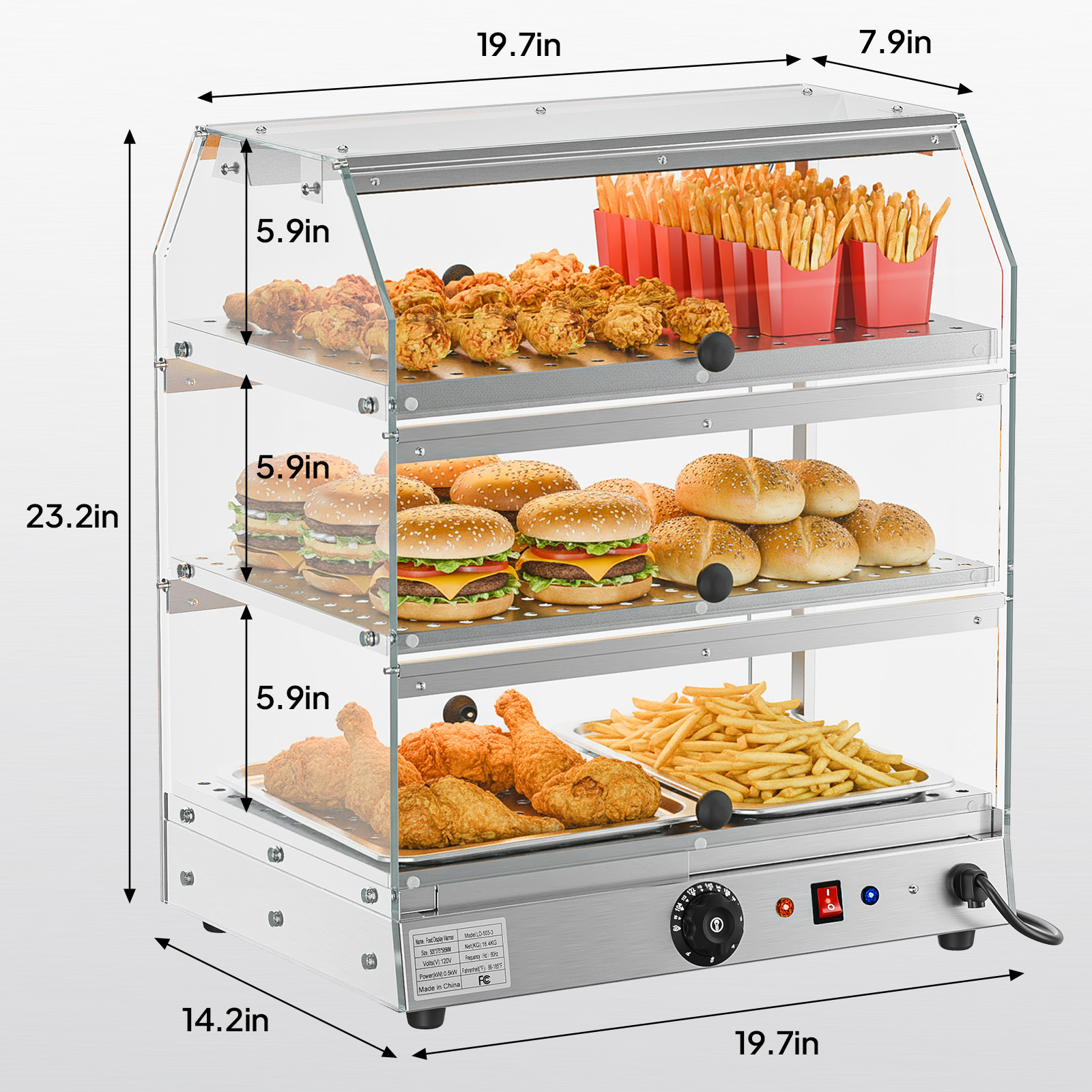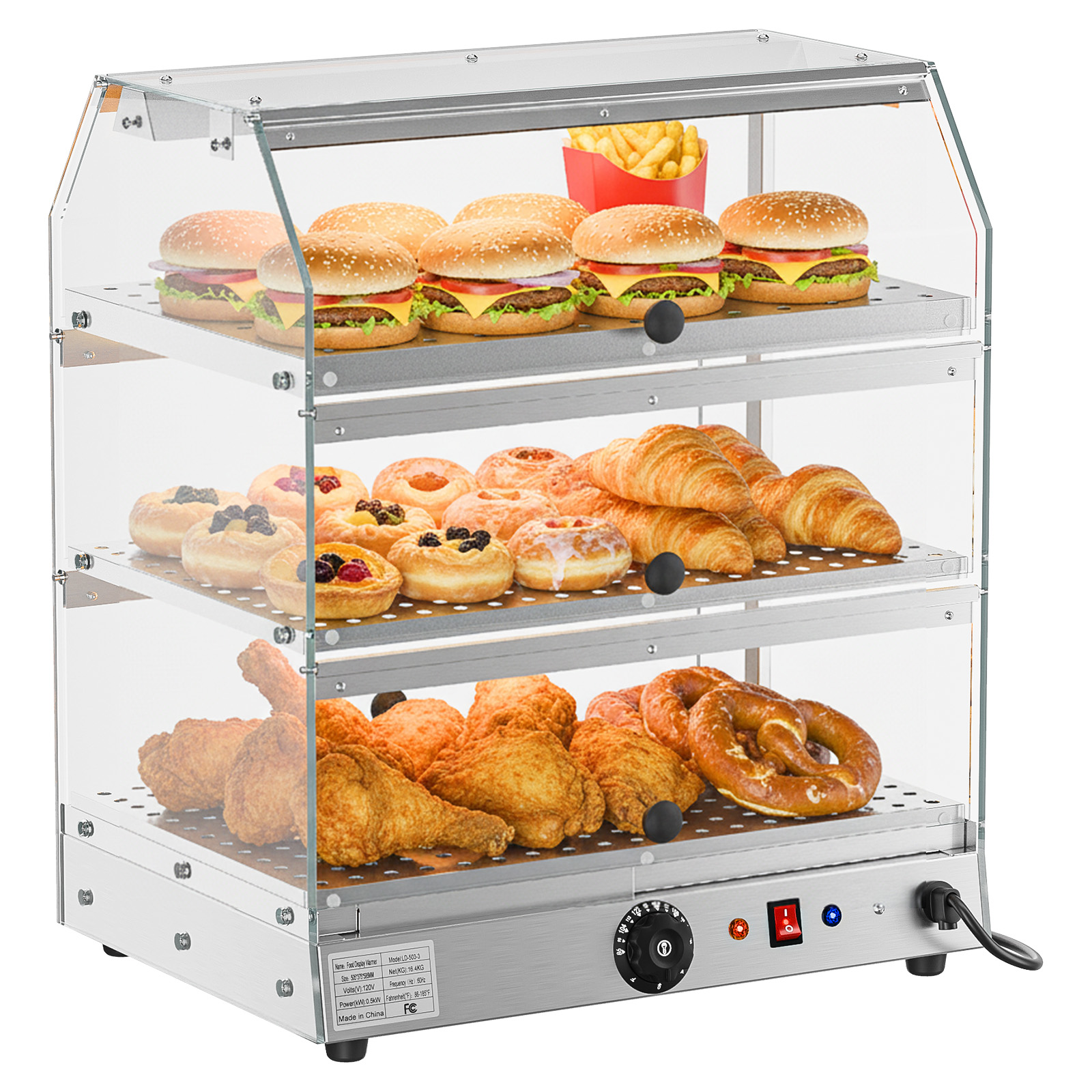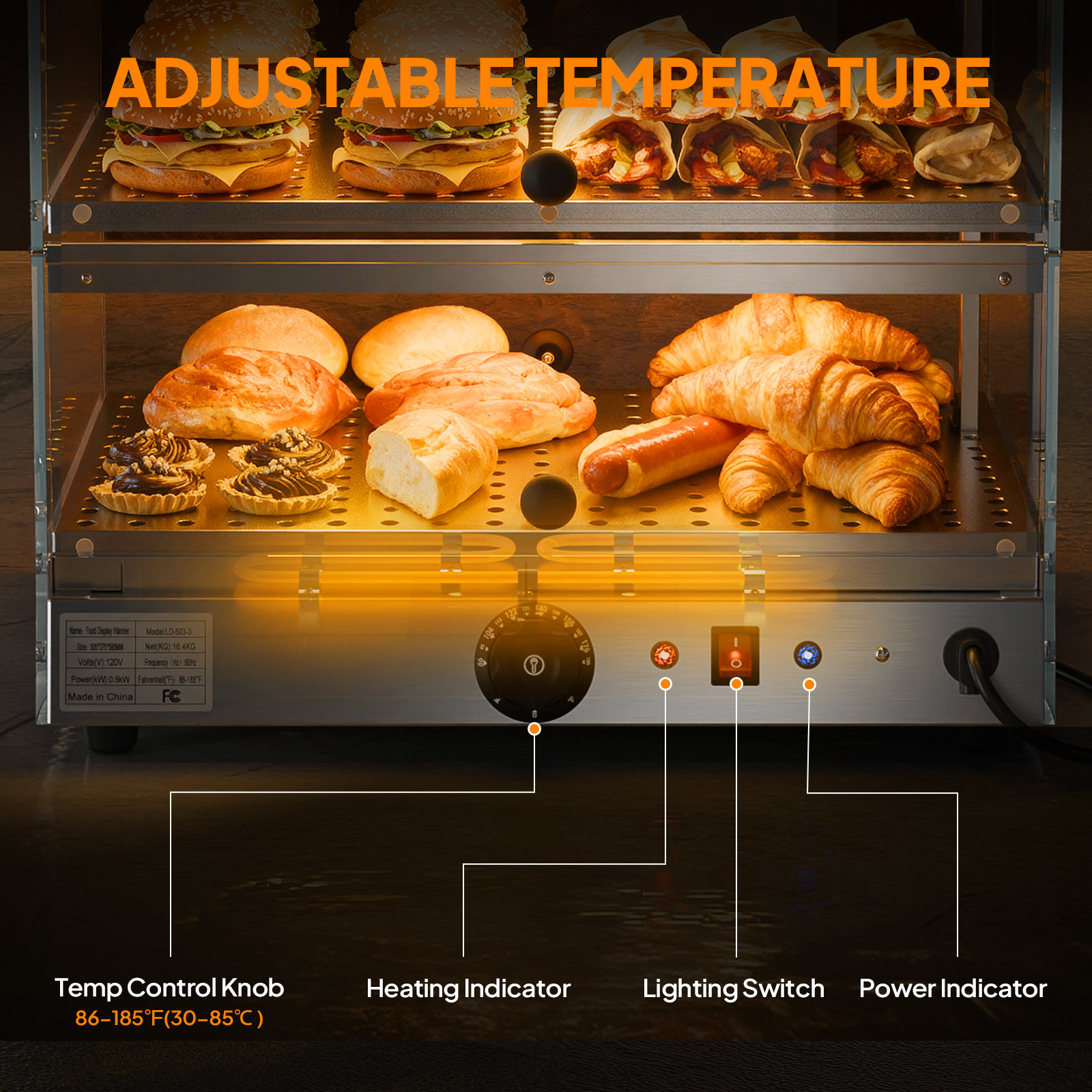 【Versatile Temperature Control】Adjust the temperature between 86-185°F with simple dial controls to suit various foods, from delicate pastries to hot sandwiches. The built-in thermostat maintains consistent warmth, preserving food quality during extended display periods. Ideal for buffets, delis, and restaurants needing flexible food warming solutions