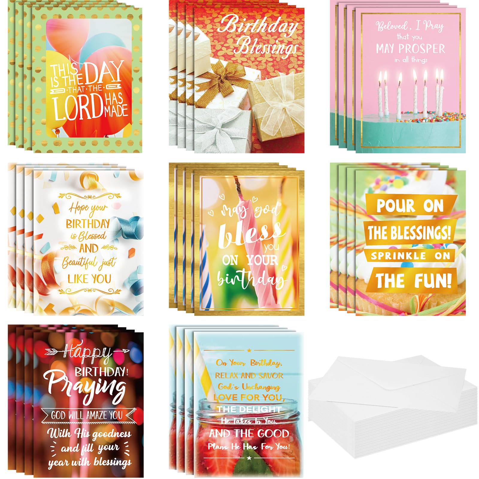- Christian Birthday Cards Collection: our package includes 32 Christian birthday cards along with 32 self-adhesive envelopes; The religious birthday cards come with 8 different religious designs; Each design comes with 4 pieces, ideal for bulk use, and embodies colorful and religious sentiments; Printed with warm words such as [Happy Birthday], [Birthday Blessings], [May God Bless You On Your Birthday] and more, these religious birthday cards can express your faith and extend birthday wishes