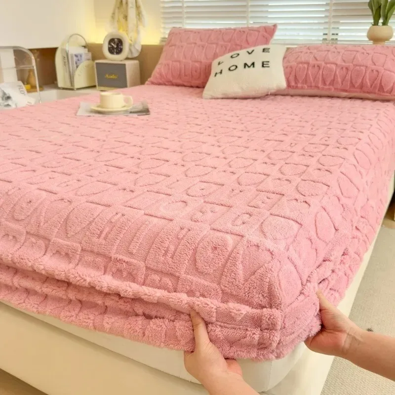 1PC Suitable for All SeasonsSolid Color Plush Fitted Sheet with Floral Pattern,Thick and Warm Autumn/Winter Bedding,Machine Washable