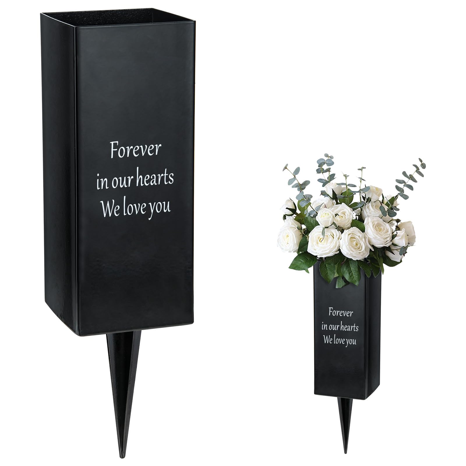 Cemetery Vases for Grave, Metal Vase Grave Decorations, Memorial Flower Holder with Spikes for Cemetery Graveside Headstone Decor, 1pcSpecifications:Size: 12.2inch/31cm tall, 3.1inch/8cm wideColor: BlackMaterial: MetalUse Occasions: Mother's Day, Father's Day, Thanksgiving, Christmas, Memorial Day grave decoration.The square cemetery vases for grave looks very elegant and beautiful, while having the sturdy metal material and solid construction.The words of ‘Forever in our hearts, We love you’ of the vase, would well express the respect and remembrance for your departed loved ones.The grave vases for cemetery is made of heavy metal, very sturdy to use year after year.The long sharp spike makes the flower vase hold up well in the ground and withstand the bad weathers will not blow away.The flower holder with spike is 12.2inch/31cm tall, and the opening of the black vase is 3.1inch/8cm wide.The large capacity vases offer you to hold up large commemorative flower decoration for the deceasedThe drainage hole of the bottom of the metal vase is provided to drain water in time.The cemetery flower vases with spikes are suitable for commemorating the decoration, such as memorial day, funerals, graves and other outdoor.The cemetery vases grave decorations are practical and beautiful, but also can be used for outdoor parties and special events decoration.Package1x metal cemetery vase and 1x metal spike are well packaged by the thick paper box, will arrive to you in the perfect condition, no worries of shipments