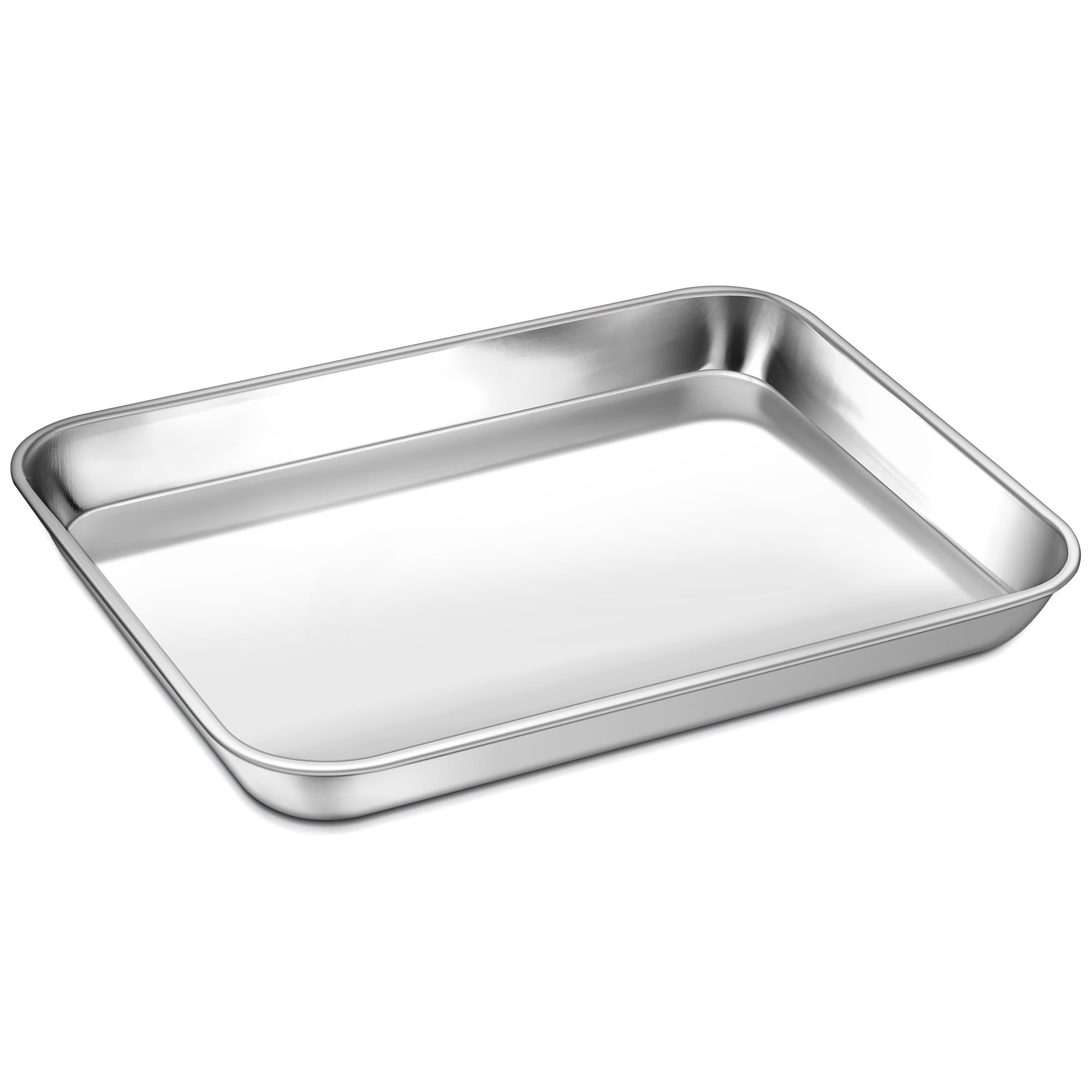 P&P CHEF Healthy Stainless Steel Toaster Oven Tray Pan, is made of pure 18/0 stainless steel, natural metal color with no chemical coating surface, bringing you a healthier cooking experience. This toaster oven pan is the perfect size for small bakings and fits most home toaster ovens. Not only used as baking tray for bread, chips, veggies, cookies, but also used as a serving tray for salad, sandwich and fruits. Cleaning is a breeze and Dishwasher Safe.SPECIFICATIONDimension: 10.5 x 8 x 1 inch, Fits most toaster ovensMaterial: Pure 430 stainless steelColor: Natural Metal SilverCraft: Superior mirror finish, Smooth roll edges, Deep rimFeatures: Non toxic, Heavy duty, Easy Clean, Dishwasher safeWHY CHOSE STAINLESS STEEL TOASTER OVEN TRAY1. Stainless steel toaster oven pan is non teflon coating and non toxic than aluminum pans2. Stainless steel toaster oven pan is dishwasher safe but aluminum not, Easily clean up even hand washing3. Stainless steel toaster oven pan has natural shining and smooth surface, less sticking to food4. Stainless steel toaster oven pan cooks food more evenly, Deep full sides to hold more foodUSING INSTRUCTION1. Please use soft dishcloth to clean the sheet for the beauty of its surface.2. Please clean and dry the sheet after using for its durability.TIP for STICKLESSYou can use a light spray or grease the pan with a little oil or butter to avoid food sticking.
