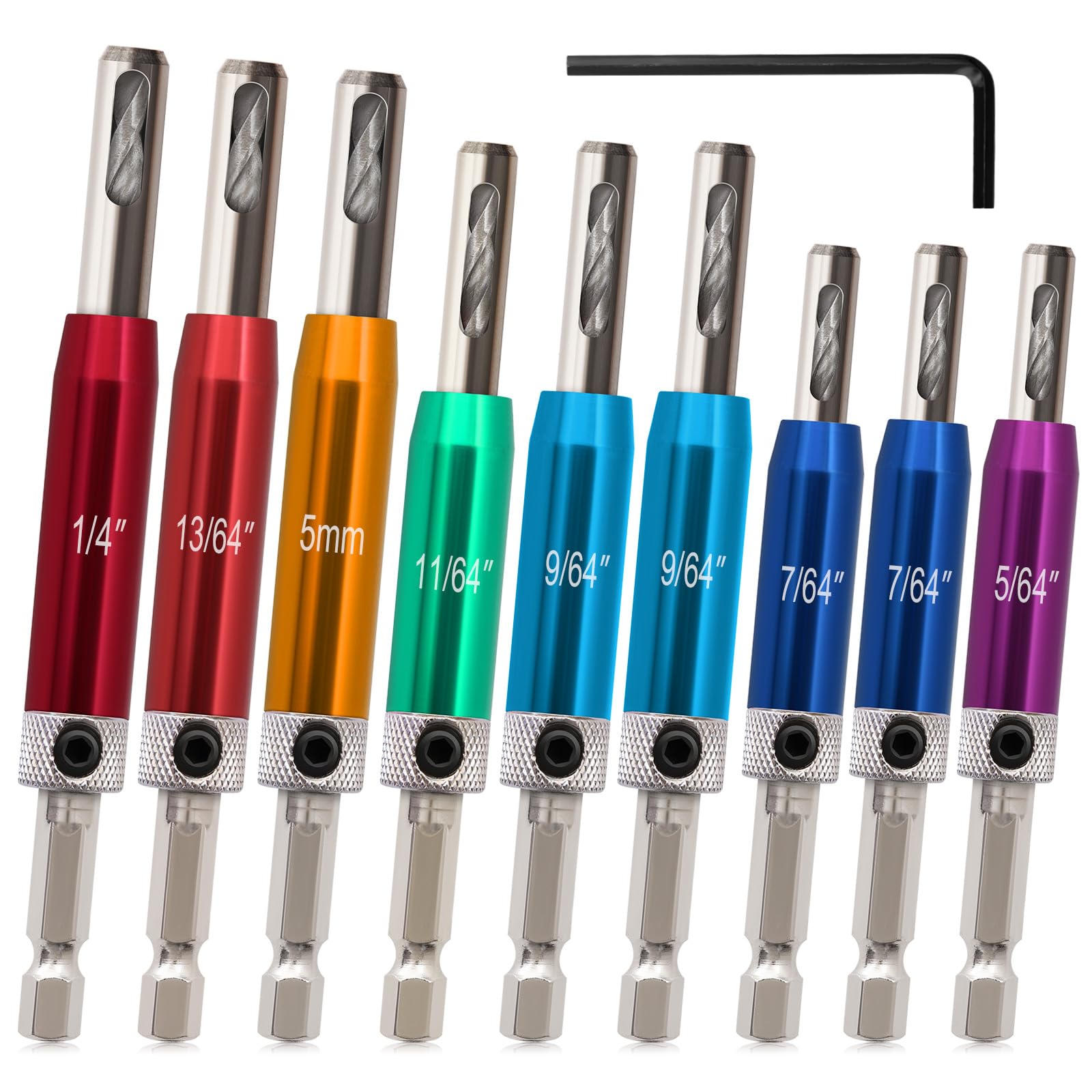 Universal 1/4" Hex Shank Design for a Wide Range of Applications. Self centering clic change door hinge combined center drill bit includes 9 vix bit and 1 hex key. The vix bit are 5/64", 7/64", 7/64", 9/64", 9/64", 11/64", 5MM, 13/64", 1/4"