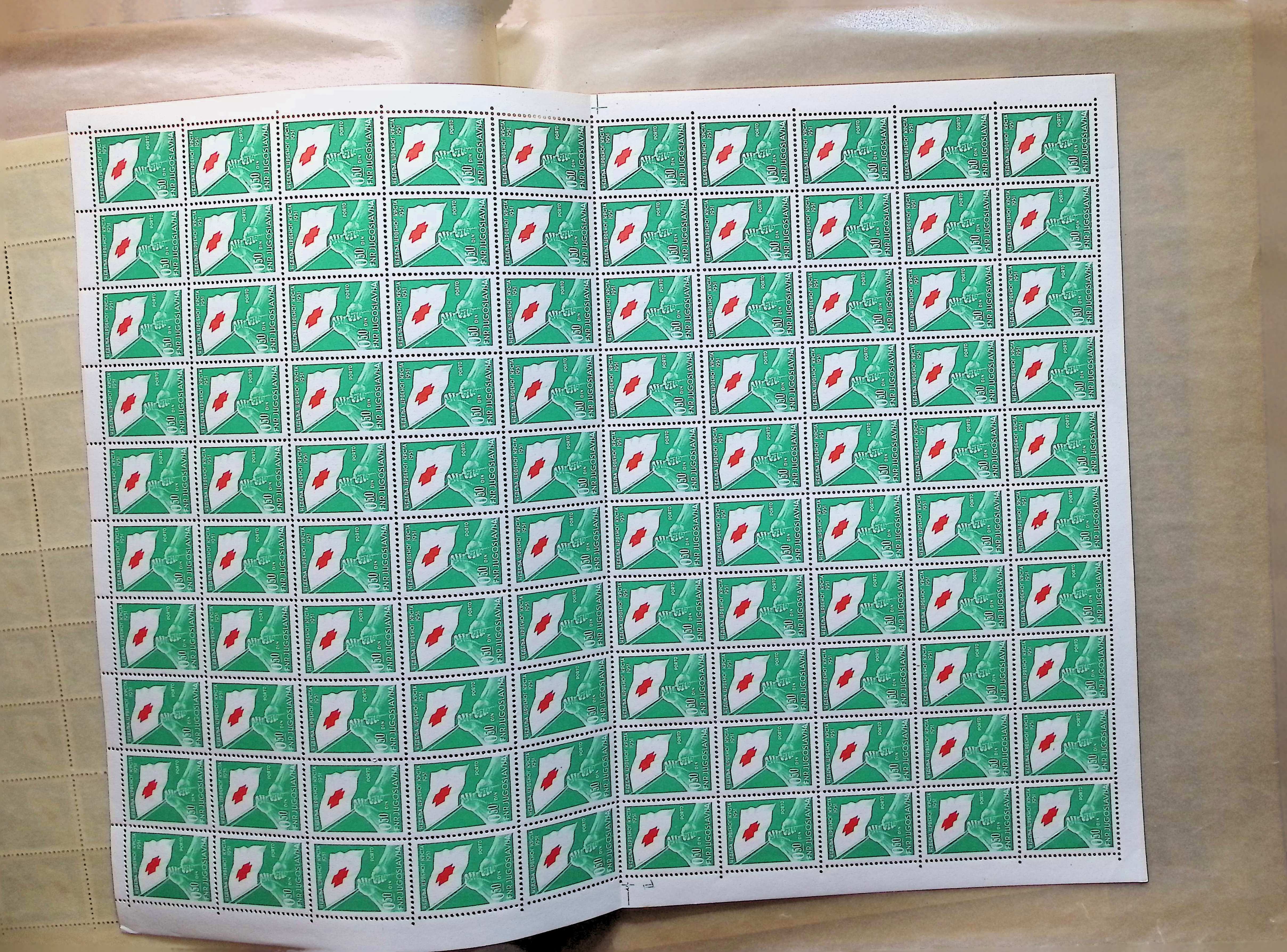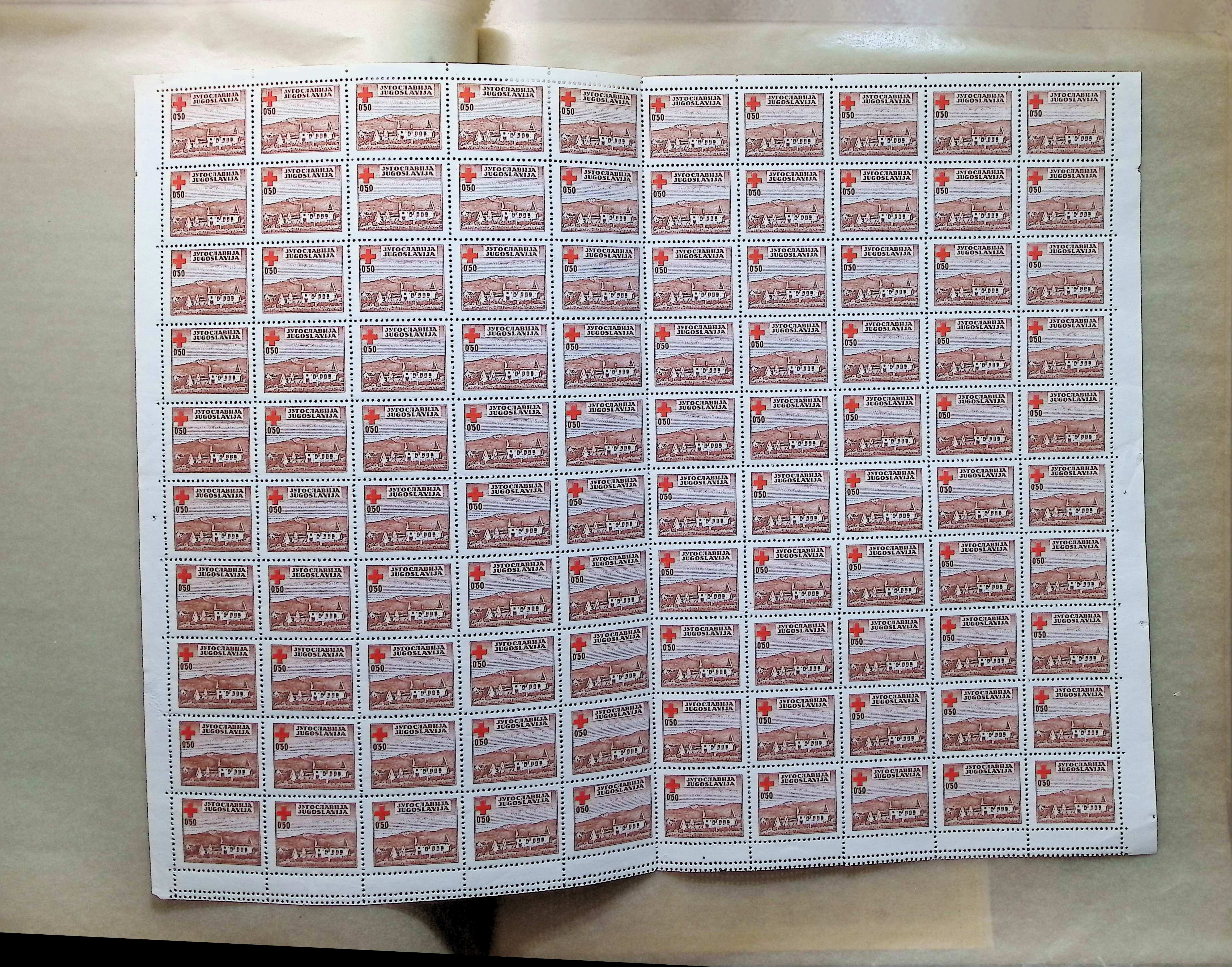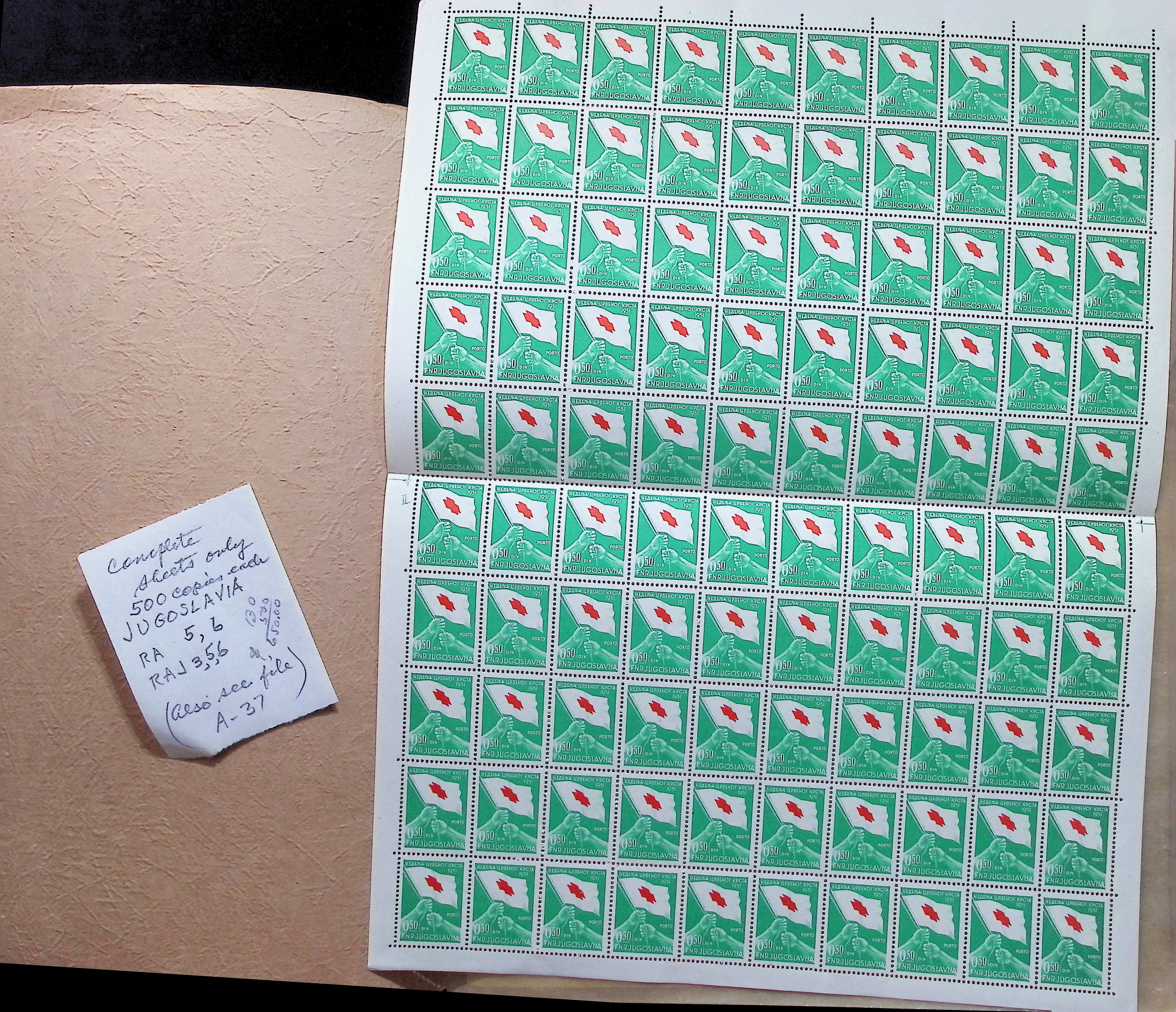 A group of Yugoslavia Postal Tax stamps in complete mint sheets in a sheet file book. Sheets have been stored with 1 fold. RA-5, 6 and RAJ-3,5,6 multiple copies 100s of stamps not all shown many duplicate sheets.