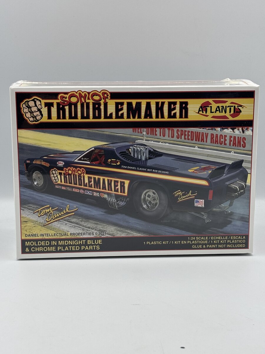 This is an Atlantis Models M2204 1:24 Scale Tom Daniel Son of Troublemaker Funny Car Plastic Model Kit. This kit is so hot! Features all new artwork by Kelly Daniel, 71 parts molded in Metallic Midnight Blue and clear with lots of chrome. Measures 8.5 inches long, Only from Atlantis. Officially licensed with Tom Daniel. Made in the USA.