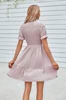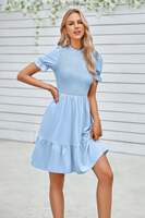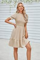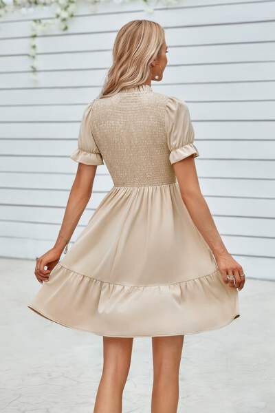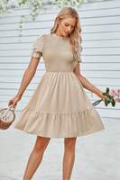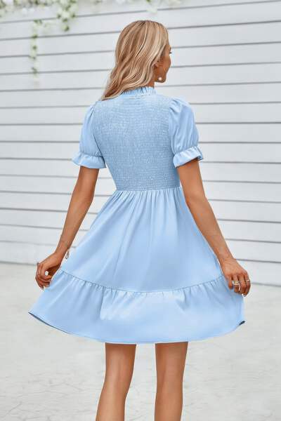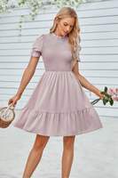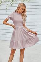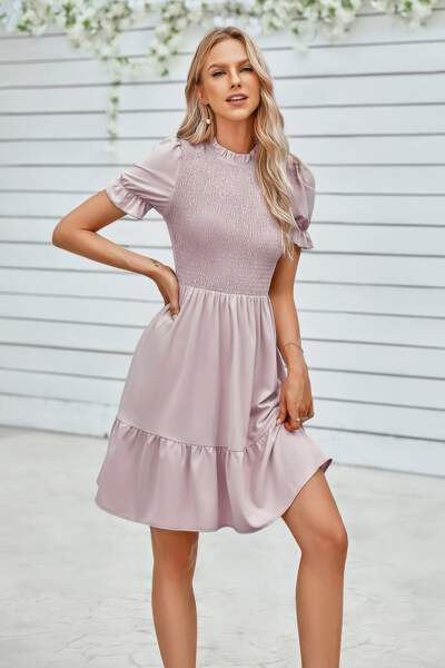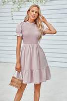 Charming and feminine, this solid puff sleeve dress features shirred detailing and a ruffle hem for a playful, flattering silhouette. Crafted from 100% polyester, it offers a lightweight, breathable feel that's perfect for warm-weather wear. The puff sleeves add volume and vintage-inspired elegance, while the shirred bodice enhances shape and comfort. Finished with a flirty ruffle hem, this dress is ideal for casual days, outdoor events, or vacation strolls with style and ease.
