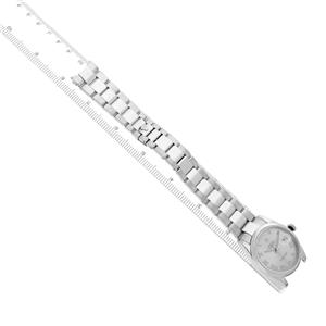 Silver dial with raised Roman numeral hour markers. Date calendar at 3 o'clock aperture. Day window at 12 o'clock aperture. |
