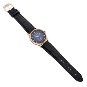 Black leather strap with an 18k rose gold tang buckle. |
