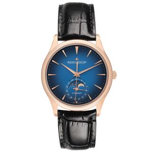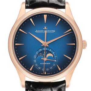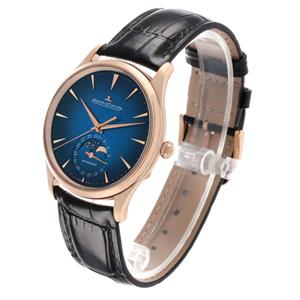 Gradient blue dial with rose gold raised dagger hour markers. Outer minute divisions. Dauphine hands. Date and Moonphase sub-dial at 6 o'clock. |