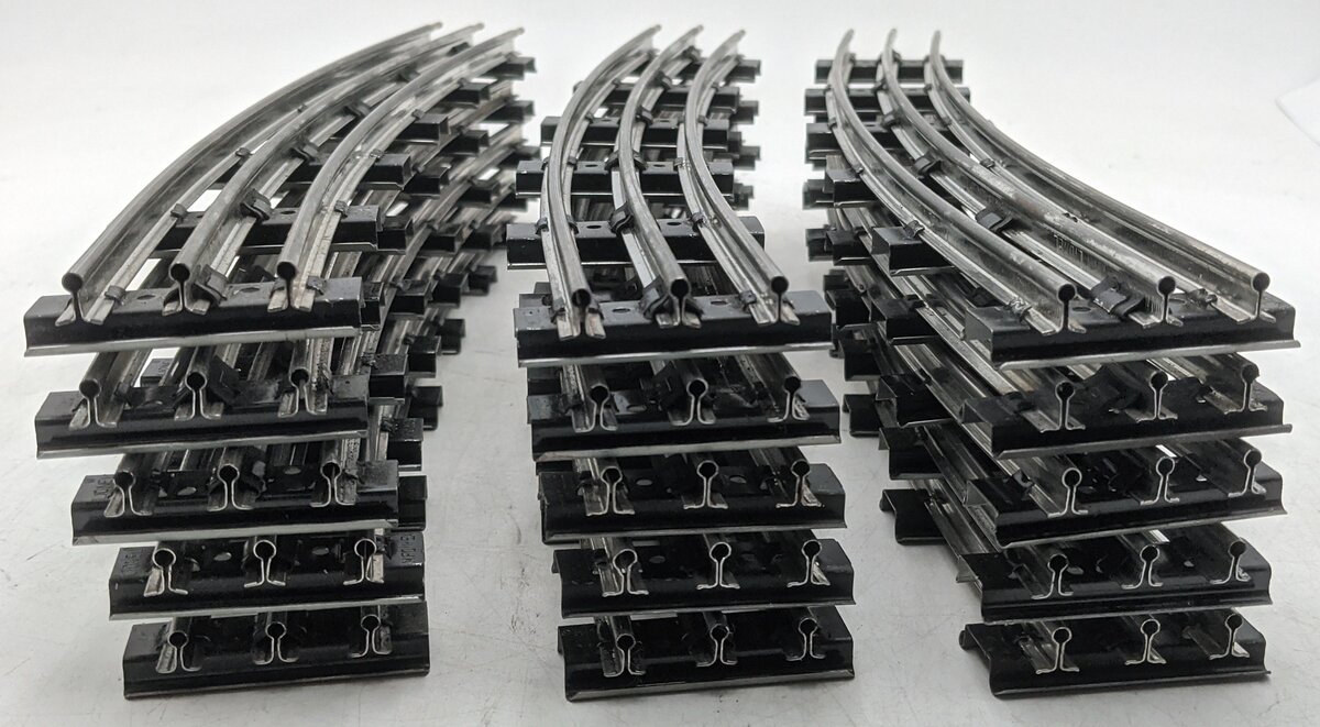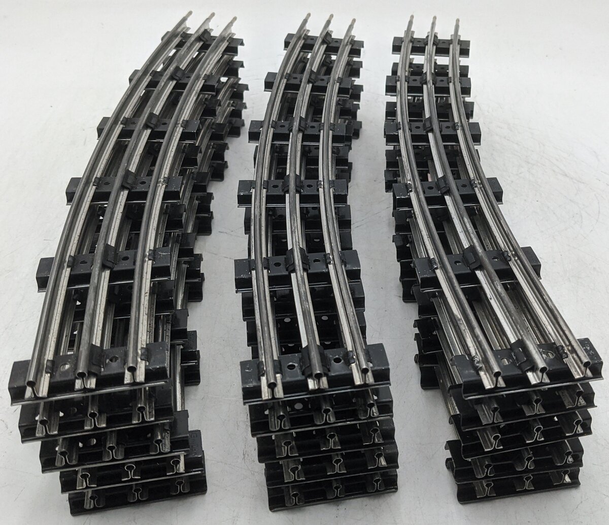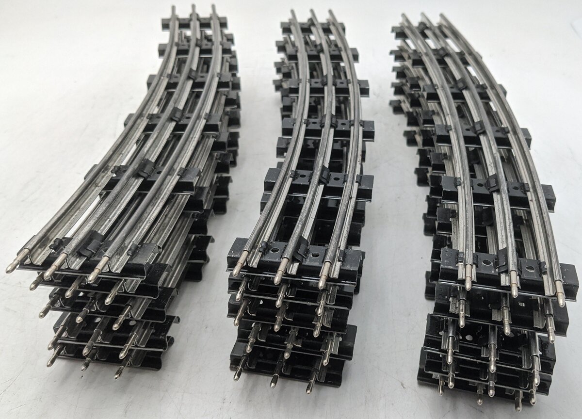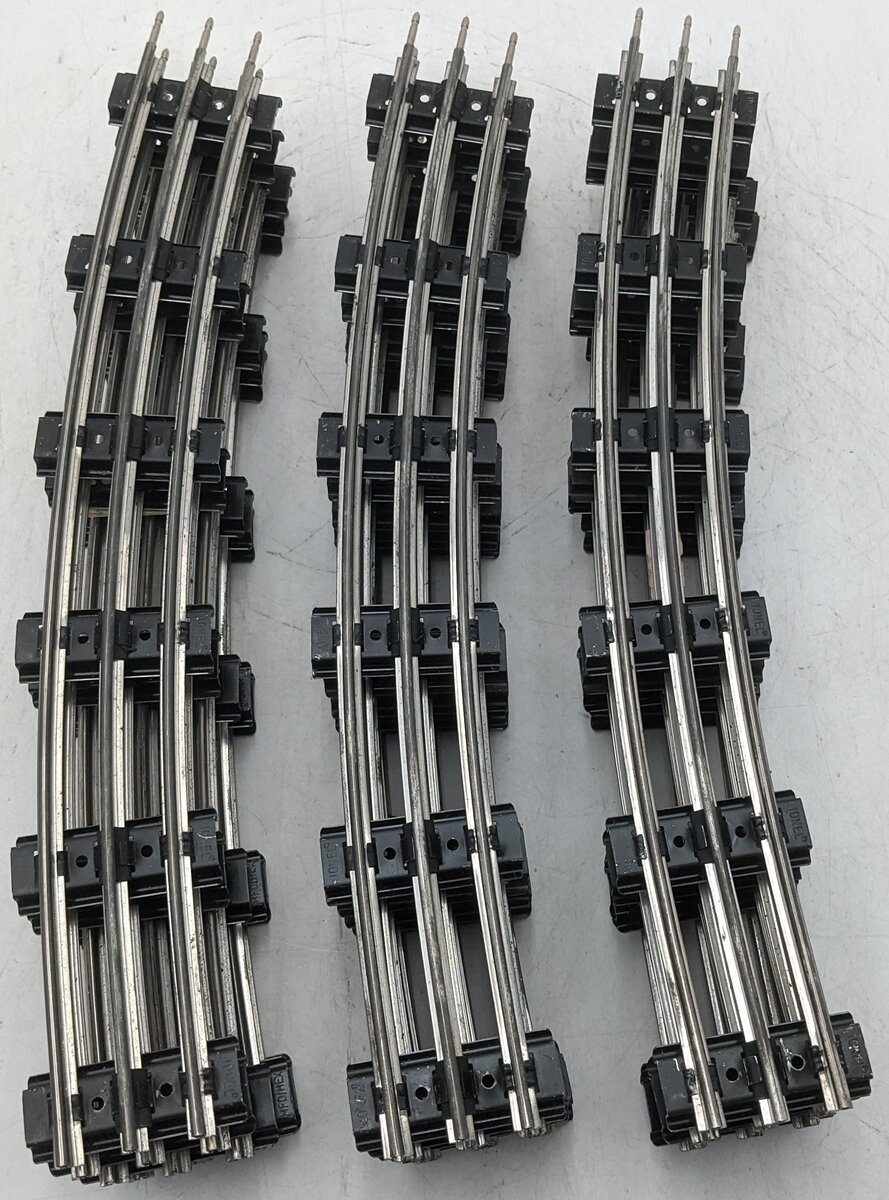 Here are Lionel 6-65572 O Gauge O72 Curved Track (15). The tracks feature metal ties and metal railings. 16 sections are required to form a complete a 72 inch diameter circle.