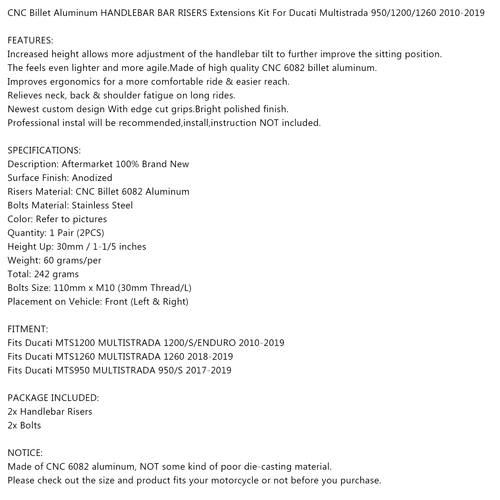 CNC Billet Aluminum HANDLEBAR BAR RISERS Extensions Kit For Ducati Multistrada 950/1200/1260 2010-2019