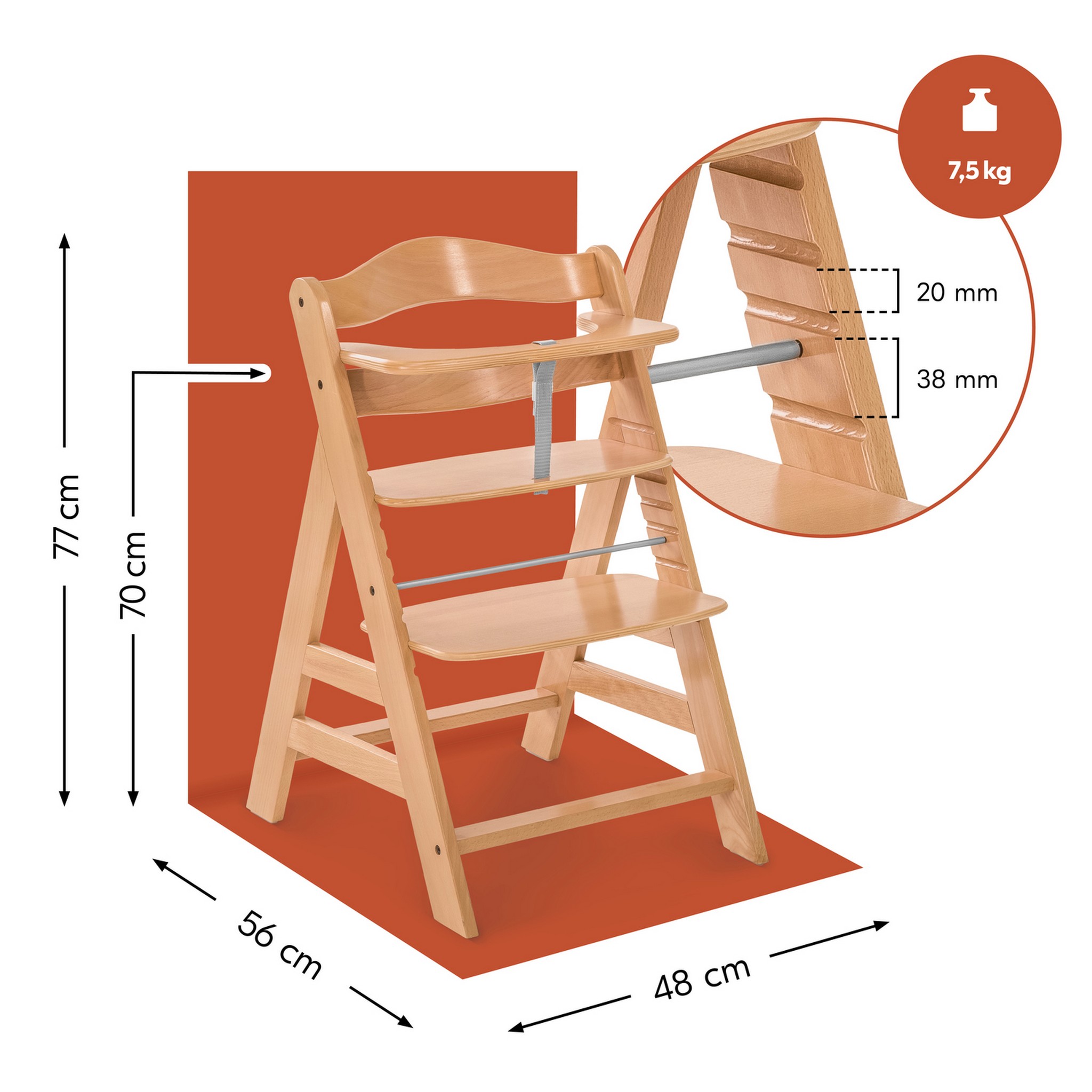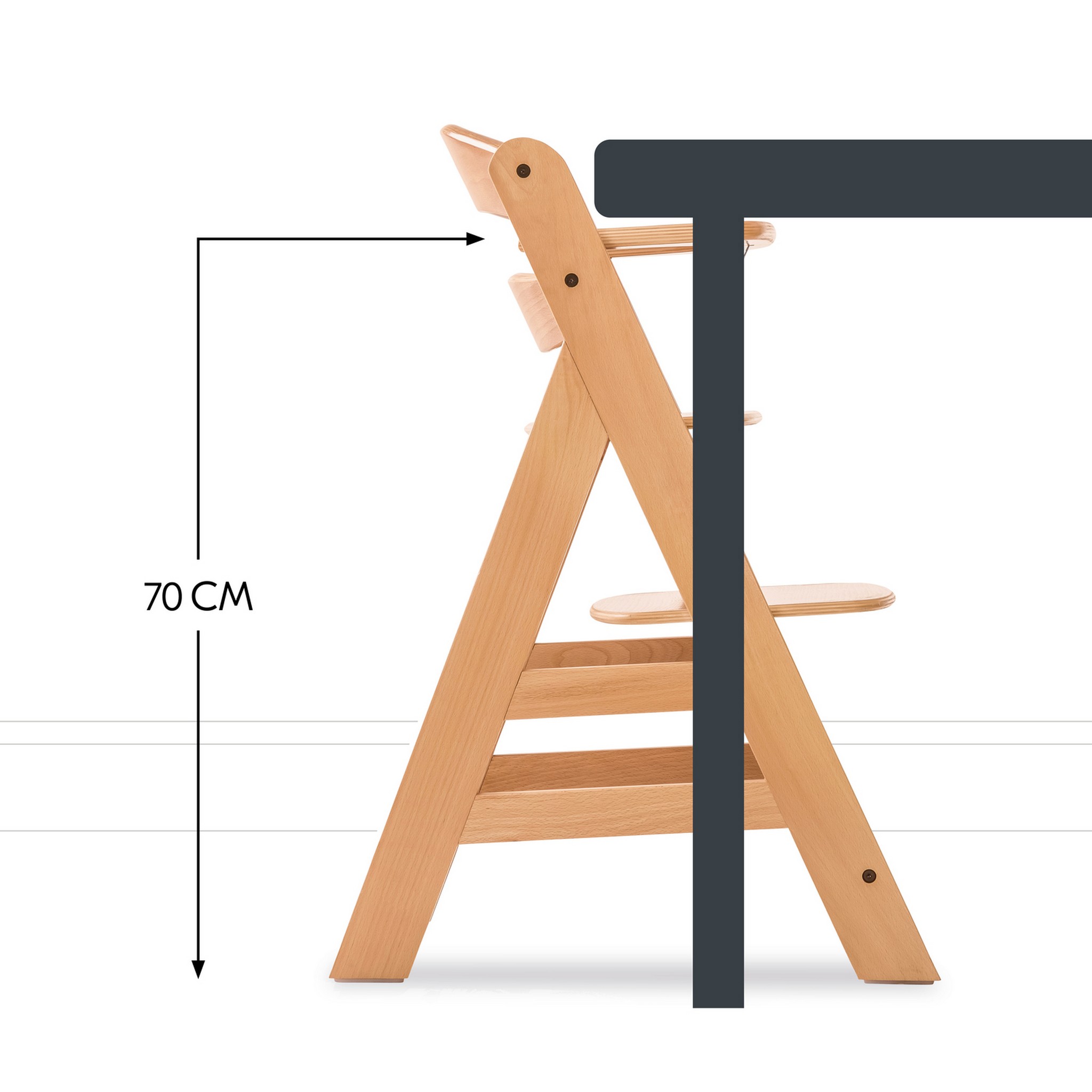 Immer mit am Tisch: Mit dem Alpha+ Holzhochstuhl und dem Highchair Bouncer Newborn-Aufsatz hast du dein Kind von Anfang an dabei. Den verstellbaren Hochstuhl passt du an die Größe deines Kindes an, bis 90 kg. Der Alpha+ passt samt Vorderbügel mit einer Höhe von 70 cm unter fast jeden Esstisch.