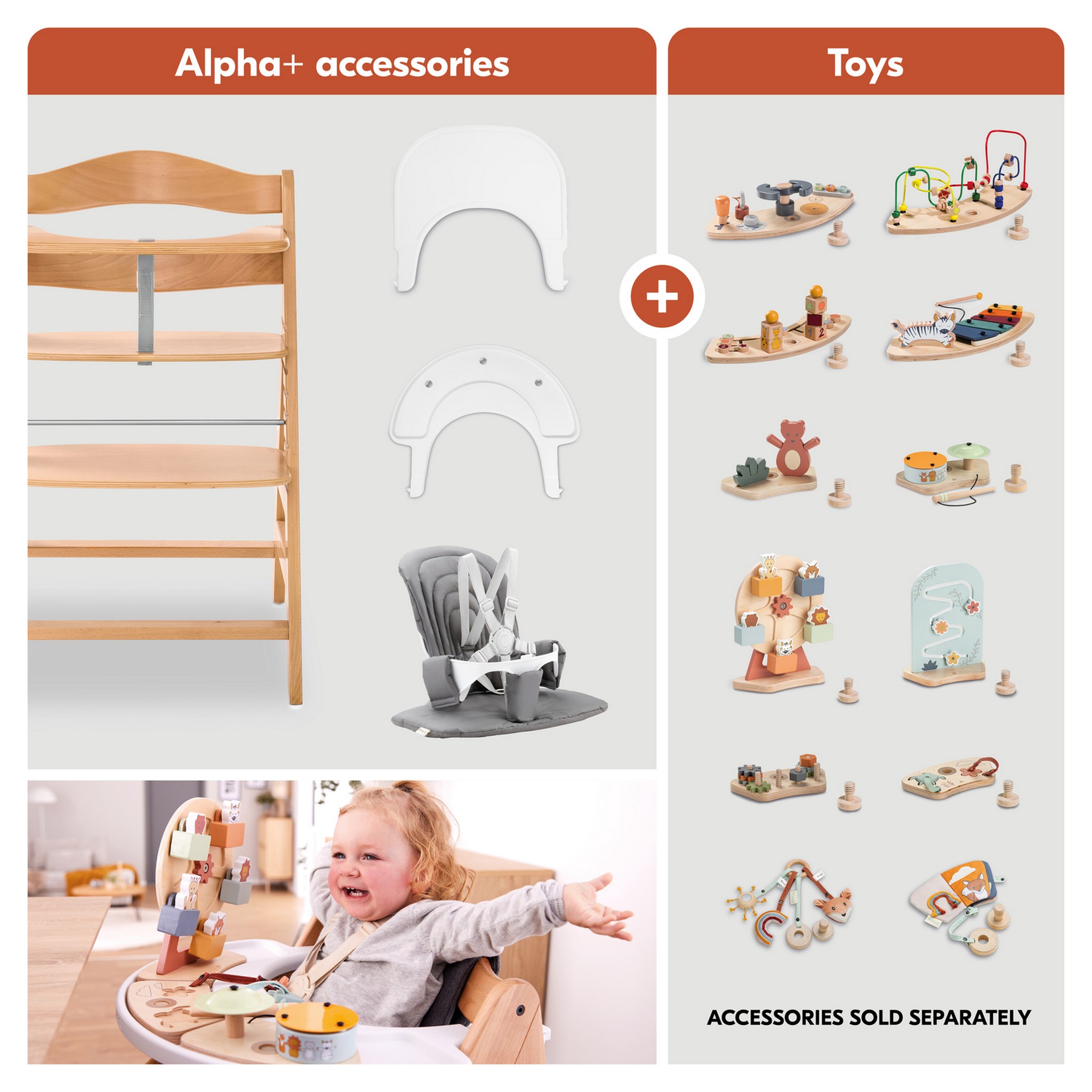 Passend zum Hochstuhl-Set gibt es zahlreiches Zubehör wie Spielbogen, Sitzverkleinerer, Sitzkissen, Essbrett, Spielbrett mit tollen Spielaufsätzen, Motorikbrett und sogar Aufbewahrungsboxen.