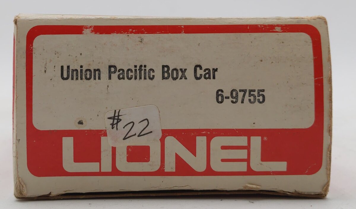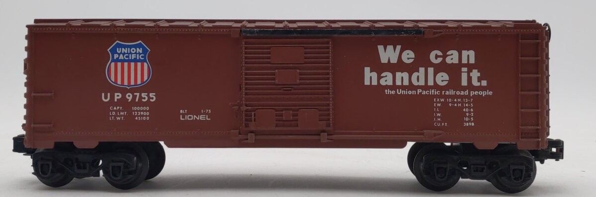 This is a Lionel 6-9755 O Gauge Union Pacific Boxcar from 1975-76. This boxcar features a plastic construction with sliding doors, plastic trucks, metal wheels and axles, and operating knuckle couplers.