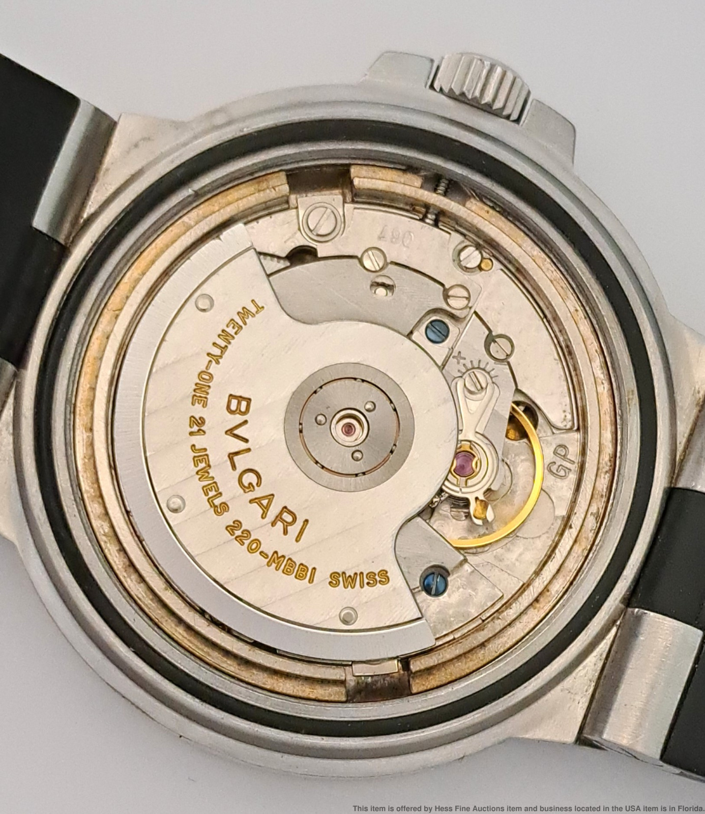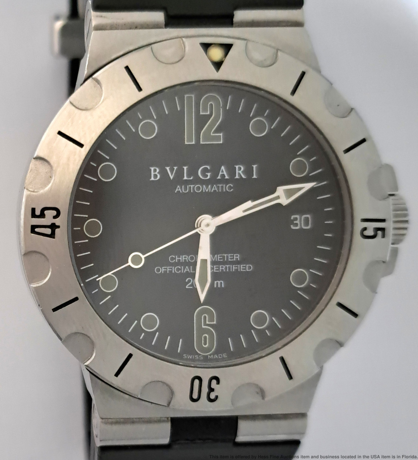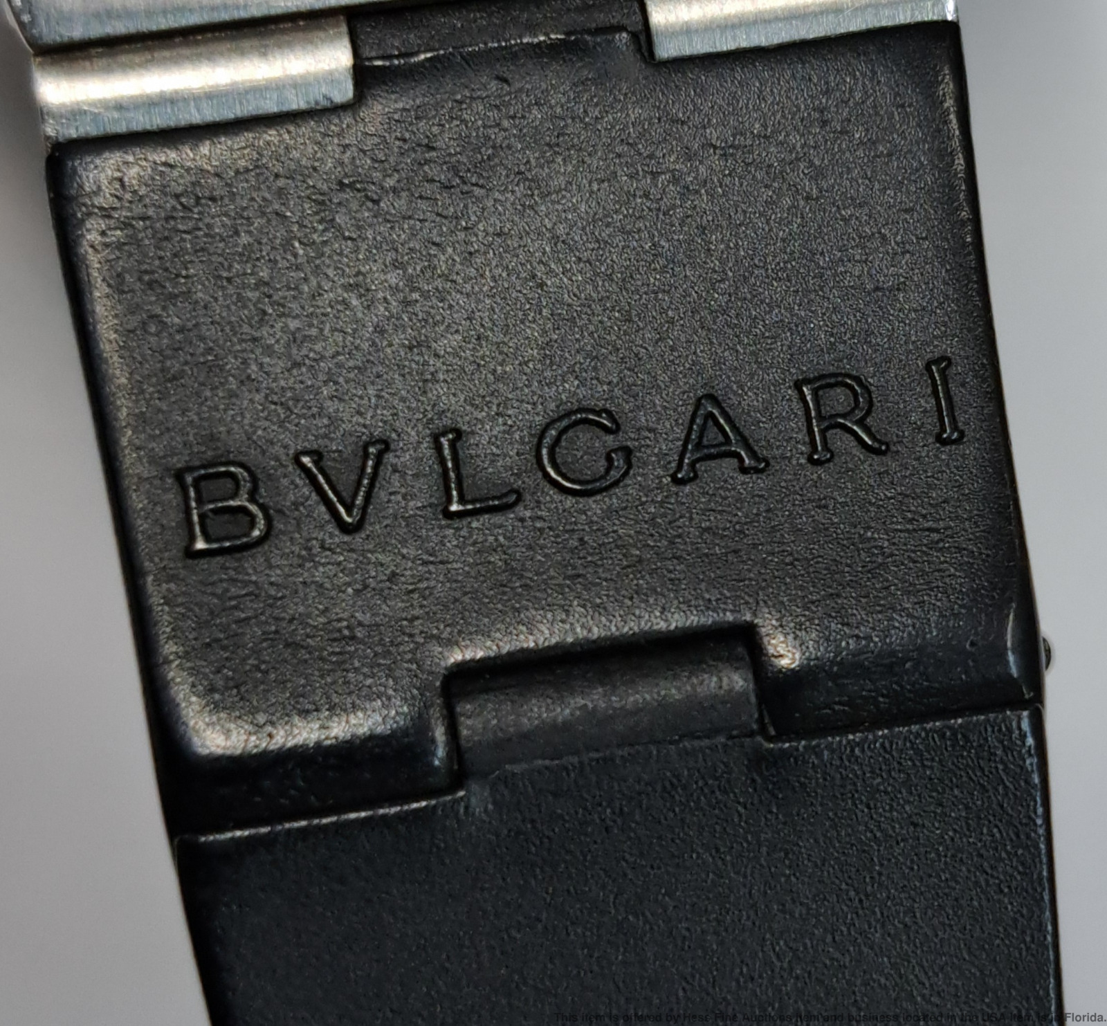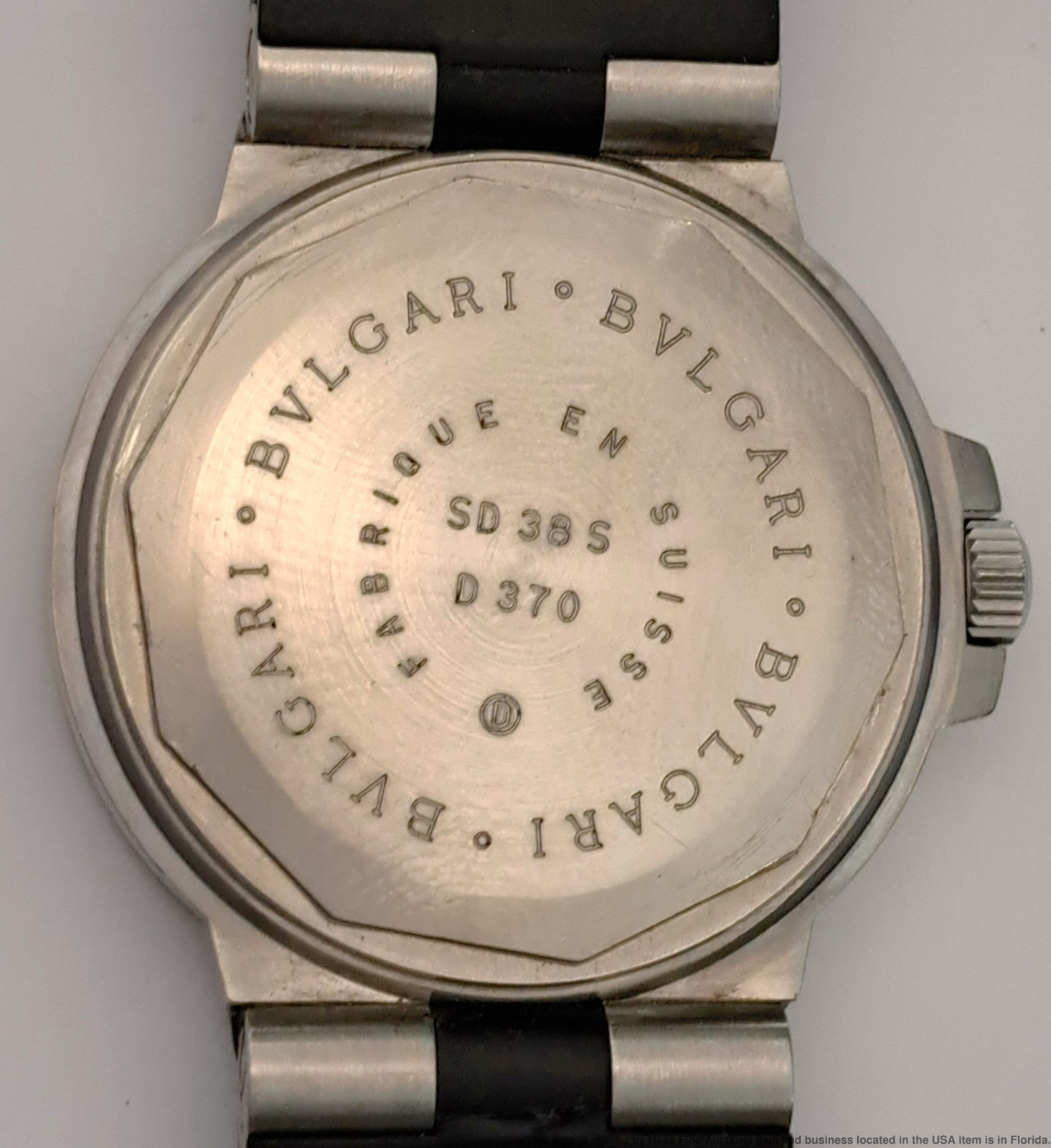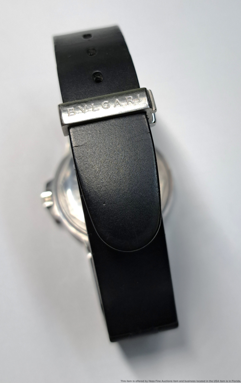 - Crystal, dial and case are all in great condition. Bracelet has some overall surface wear. Clasp is in working condition. Described By: Sam 69651 NTDD Title: Beautiful Black Bulgari Diagono Scuba SD38S Mens Automatic Date Wristwatch 38 mm Description: Beautiful Black Bulgari Diagono Scuba SD38S Mens Automatic Date Wristwatch 38 mm. In ready to wear condition. Condition: Crystal, dial and case are all in great condition. Bracelet has some overall surface wear. Clasp is in working condition. Movement Condition: Movement is running. For optimum timekeeping accuracy we suggest an overhaul at buyers expense Case Size: 38 mm Case Thickness: 10 mm Lug End to End: 46 mm Lug Width: 7 mm Total Length or Circumference: 7 1/2 in circumference Material: Stainless steel case, rubber bracelet, clasp is stainless steel Estimated weight of piece: 90 grams Box & Papers: None Estimated size of package: 7.5 x 5.5 x 3.5; 12 oz Additional Info: If the winning bidder would like to arrange to pick up their item at our store, please notify us by email and we will make the appropriate shipping adjustments.