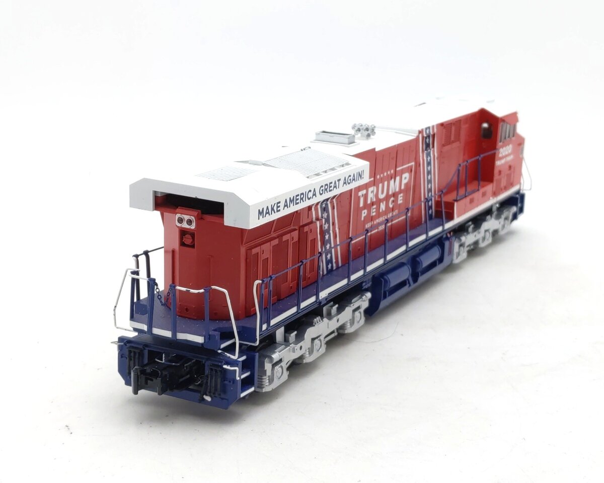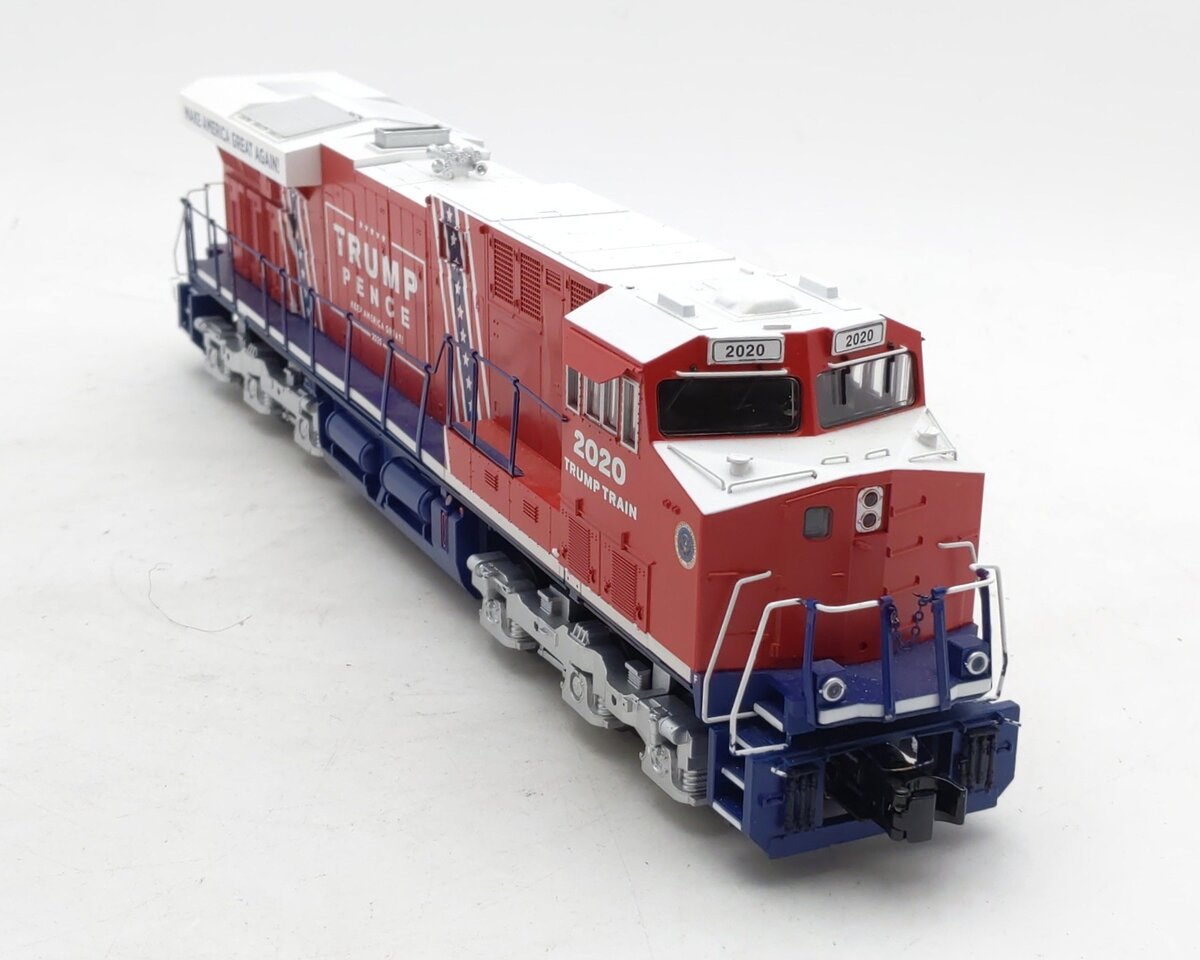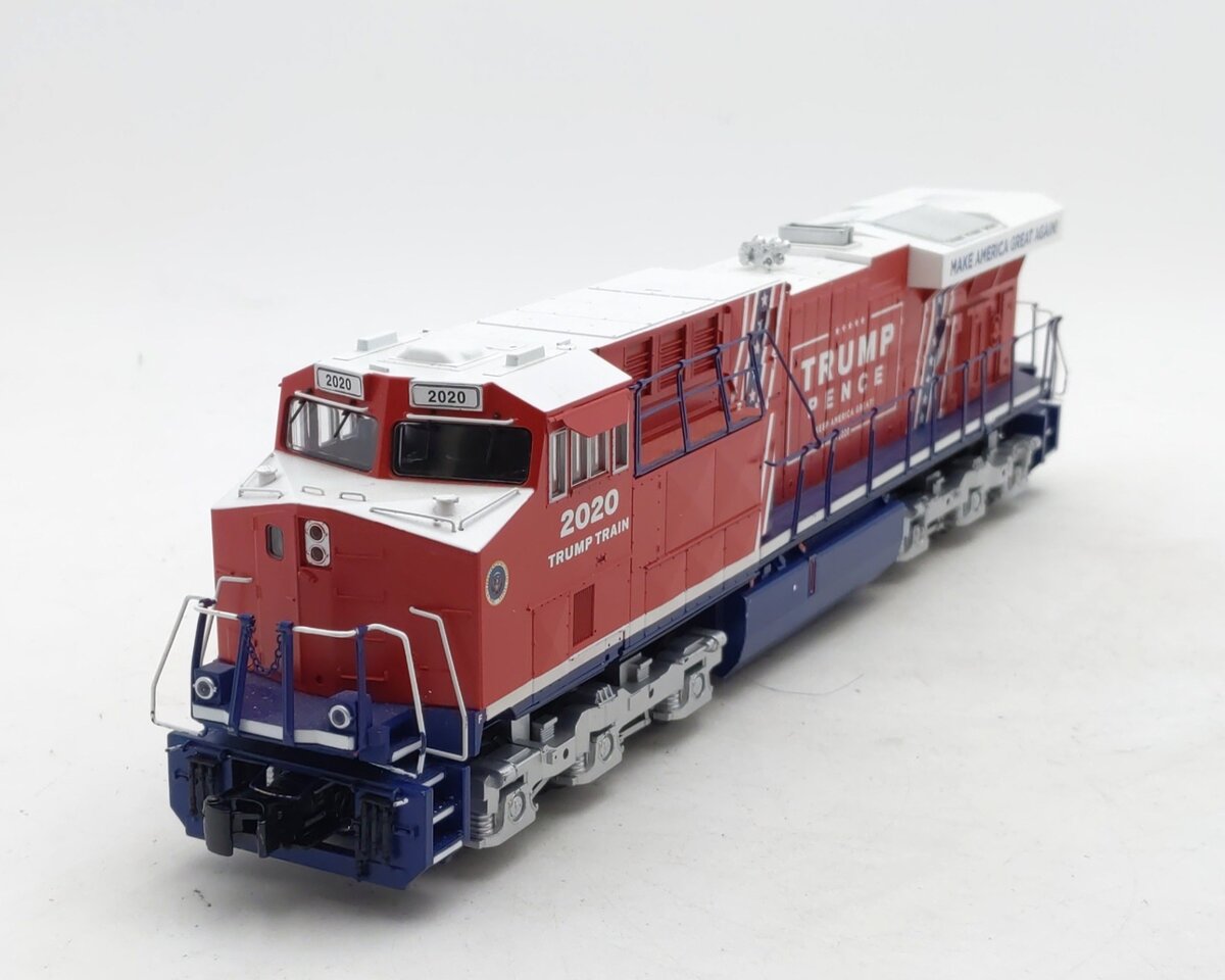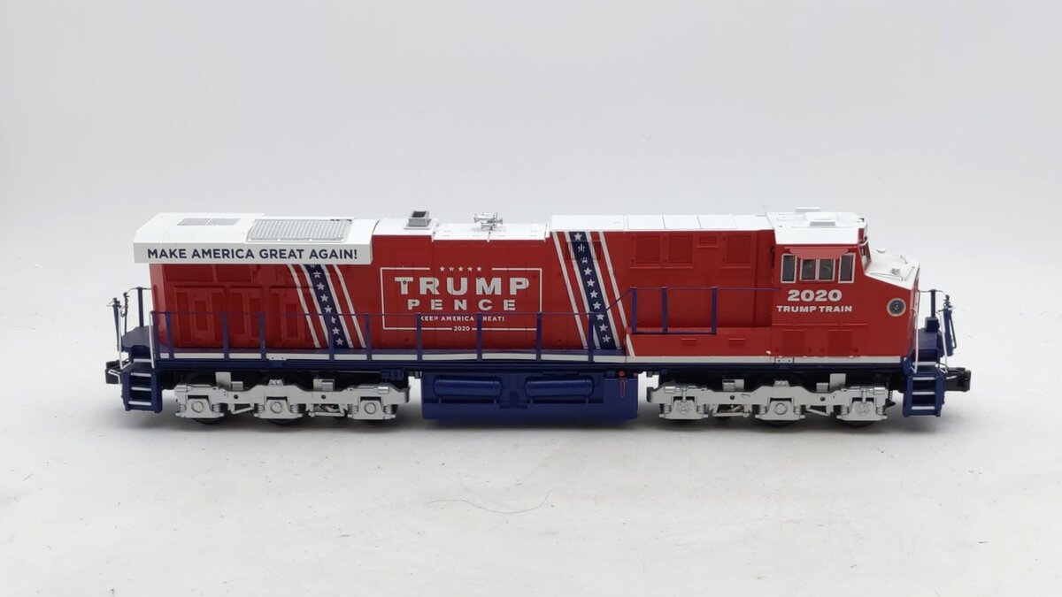 Here is an MTH 30-20799-1E O Gauge Donald J. Trump ES44AC Imperial Diesel Engine #2020 w/PS3. Features include an intricately detailed ABS Body; metal chassis; operating ditch lights and smoke unit; constant voltage headlight; die cast truck sides, pilots, and fuel tank; metal wheels, axles, and gears; remotely controlled Proto-couplers; and attractive decoration.
