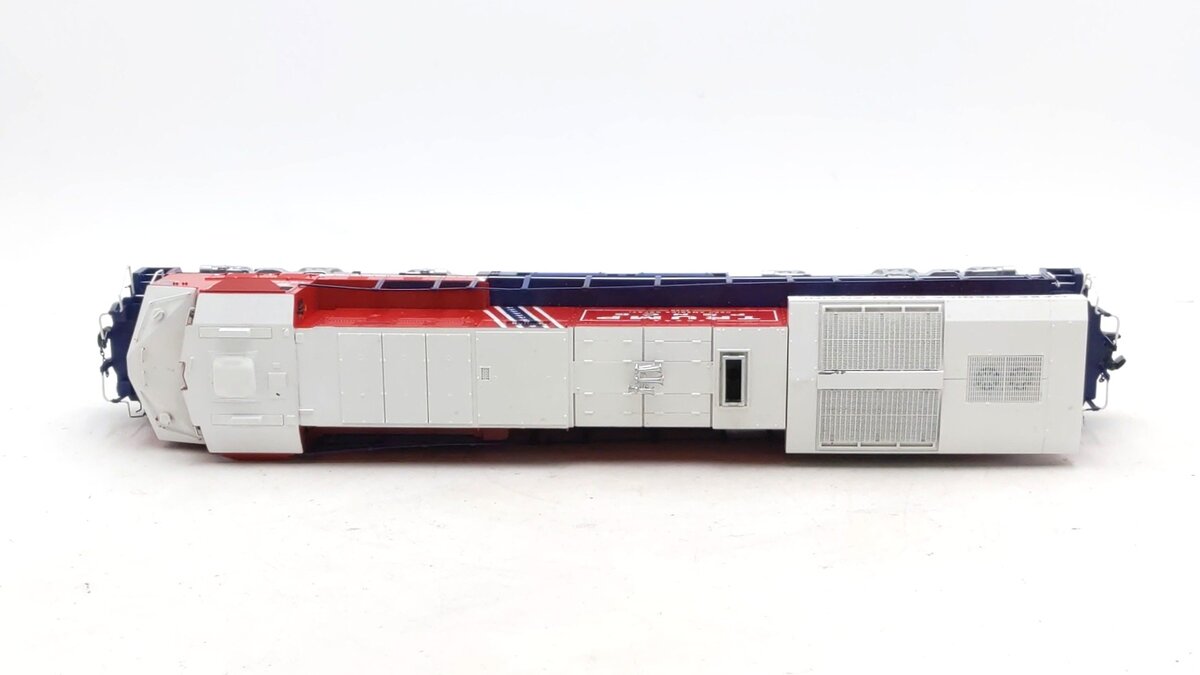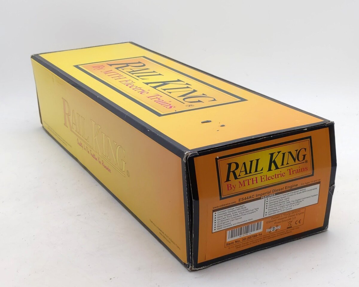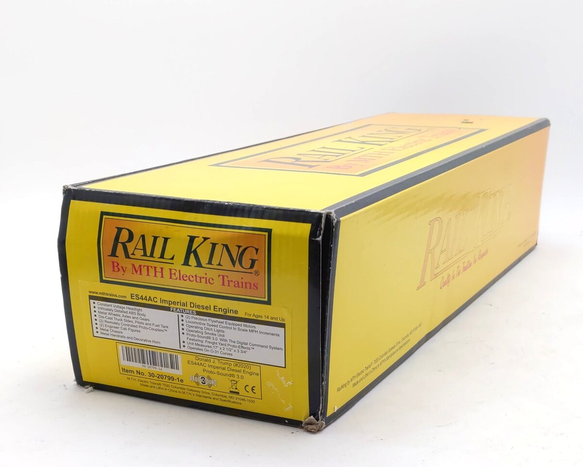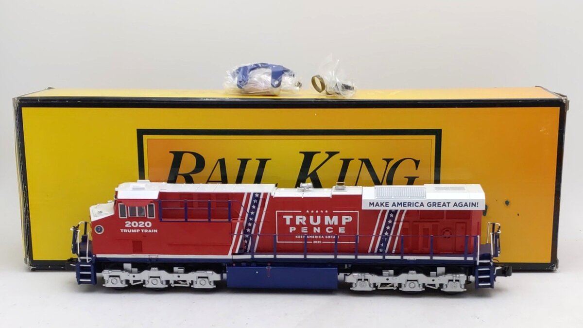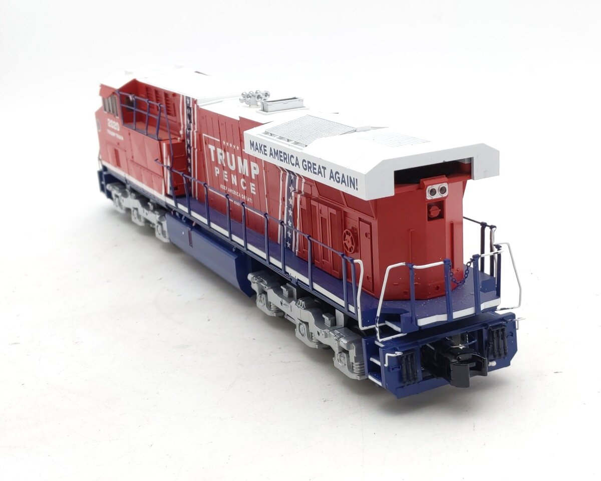 Here is an MTH 30-20799-1E O Gauge Donald J. Trump ES44AC Imperial Diesel Engine #2020 w/PS3. Features include an intricately detailed ABS Body; metal chassis; operating ditch lights and smoke unit; constant voltage headlight; die cast truck sides, pilots, and fuel tank; metal wheels, axles, and gears; remotely controlled Proto-couplers; and attractive decoration.