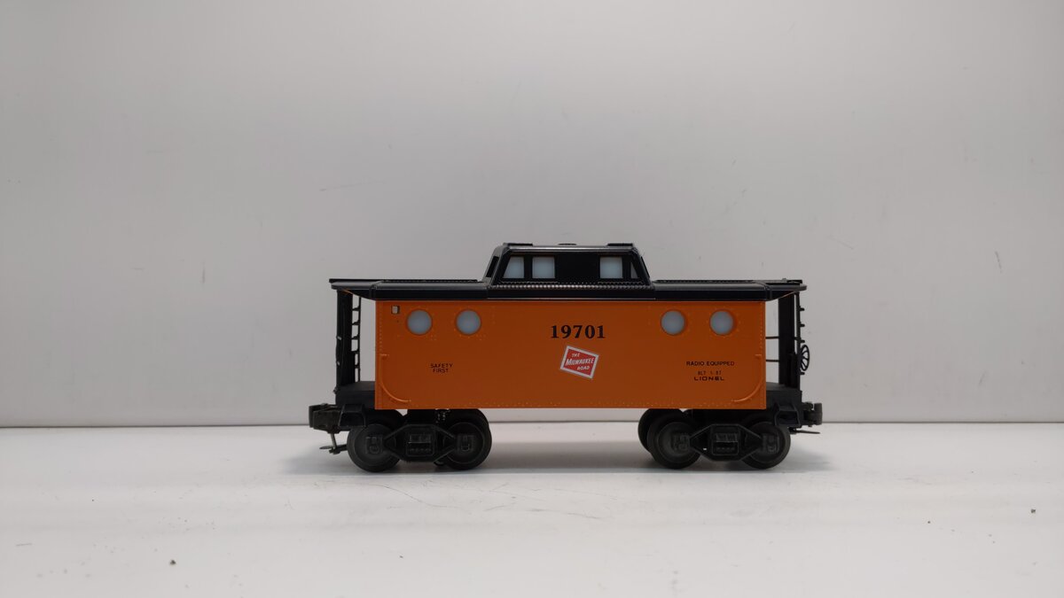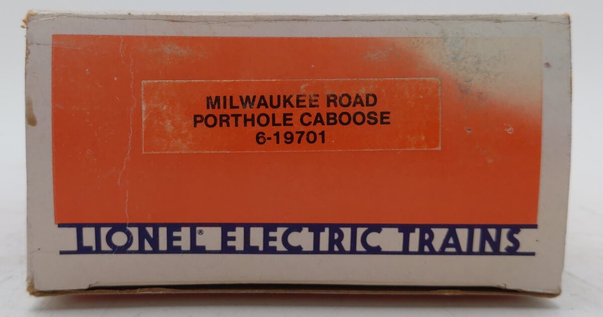 Here is a Lionel 6-19701 O Gauge Milwaukee Road N5C Porthole Caboose #19701 from 1987. This caboose was originally part of the Milwaukee Road Fallen Flags set from that year. This car is lighted and features metal trucks, operating knuckle couplers, metal wheels and axles. It measures approximately 7 1/2" long.