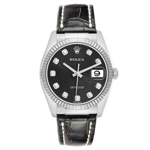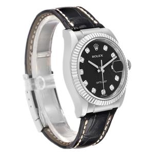 Black jubilee anniversary dial with original Rolex factory diamond hour markers. Date calendar at the 3 o'clock aperture. Outer stick minute markers. |