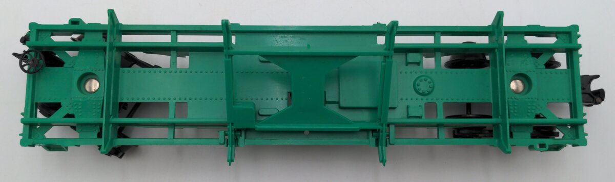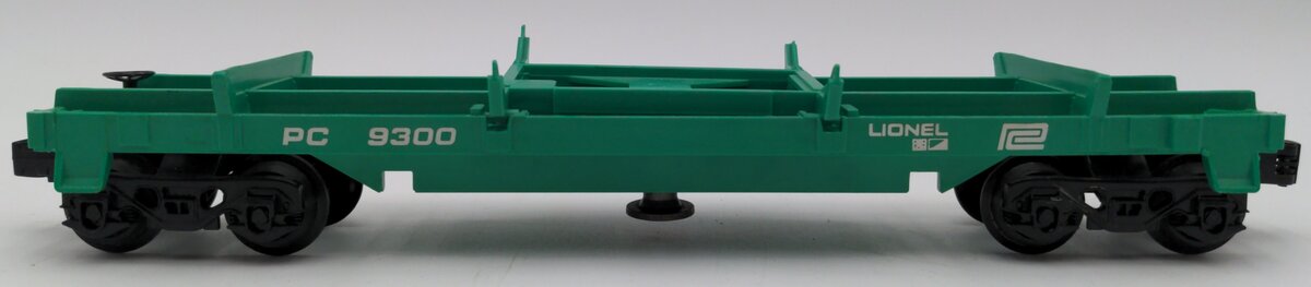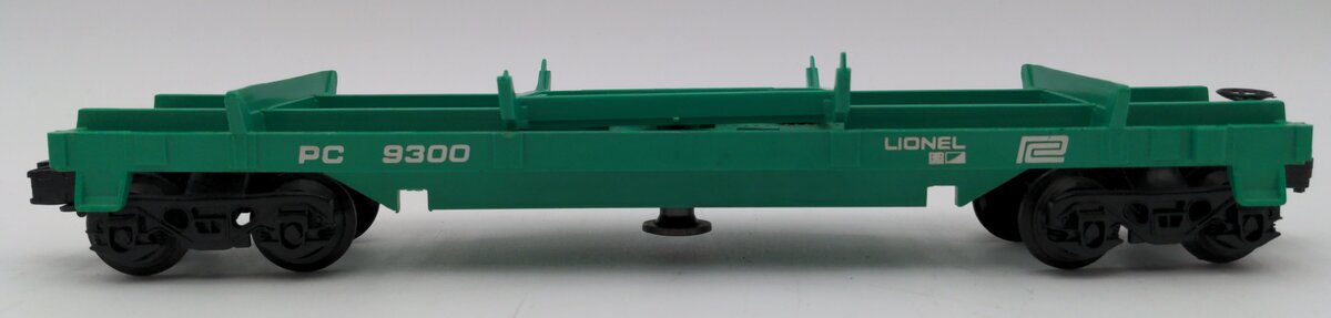 This is a Lionel 6-9300 Penn Central Operating Log Dump Car from 1970-77. This dump car features plastic trucks, an operating coupler, a fixed coupler, plastic wheels and metal axles.