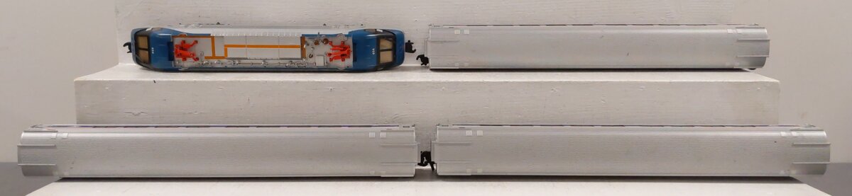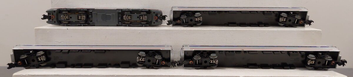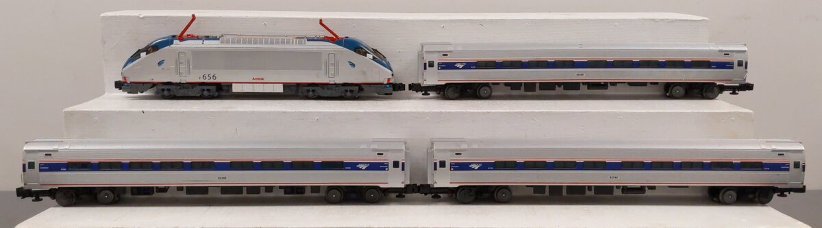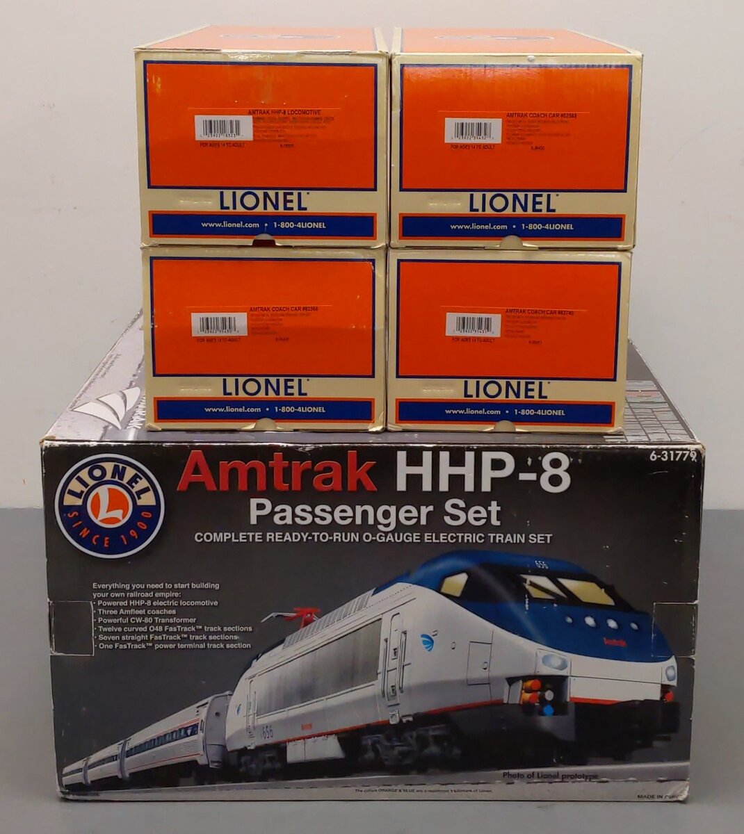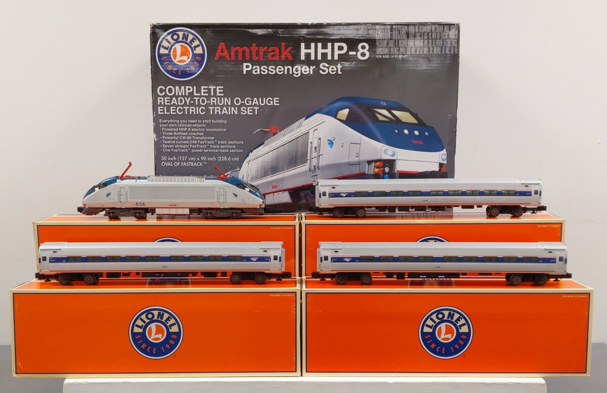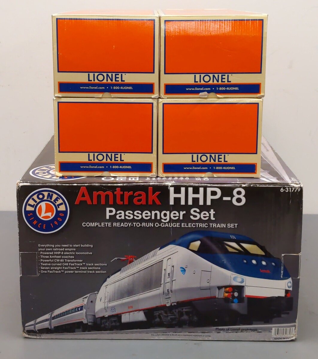Here is a Lionel 6-31779 O Gauge Amtrak HHP-8 Amfleet Electric Passenger Train Set. This set includes [1] powered locomotive and [3] passenger cars. Each car features die-cast metal sprung trucks, metal wheels and axles, and operating knuckle couplers. Track and transfomer are not included.