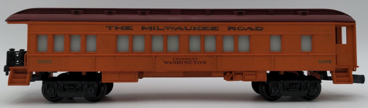 This is a Lionel 6-9502 O Gauge Milwaukee Road "President Washington" Observation Car from 1973. Features include a durable ABS body, interior illumination, plastic trucks, plastic knuckle couplers, and metal wheels and axles. It measures 12 inches long.