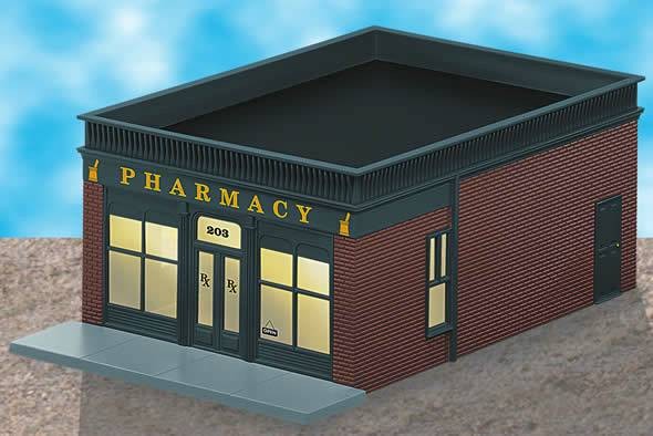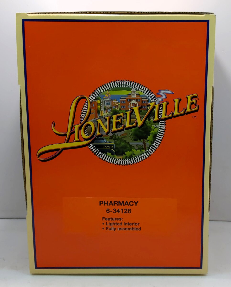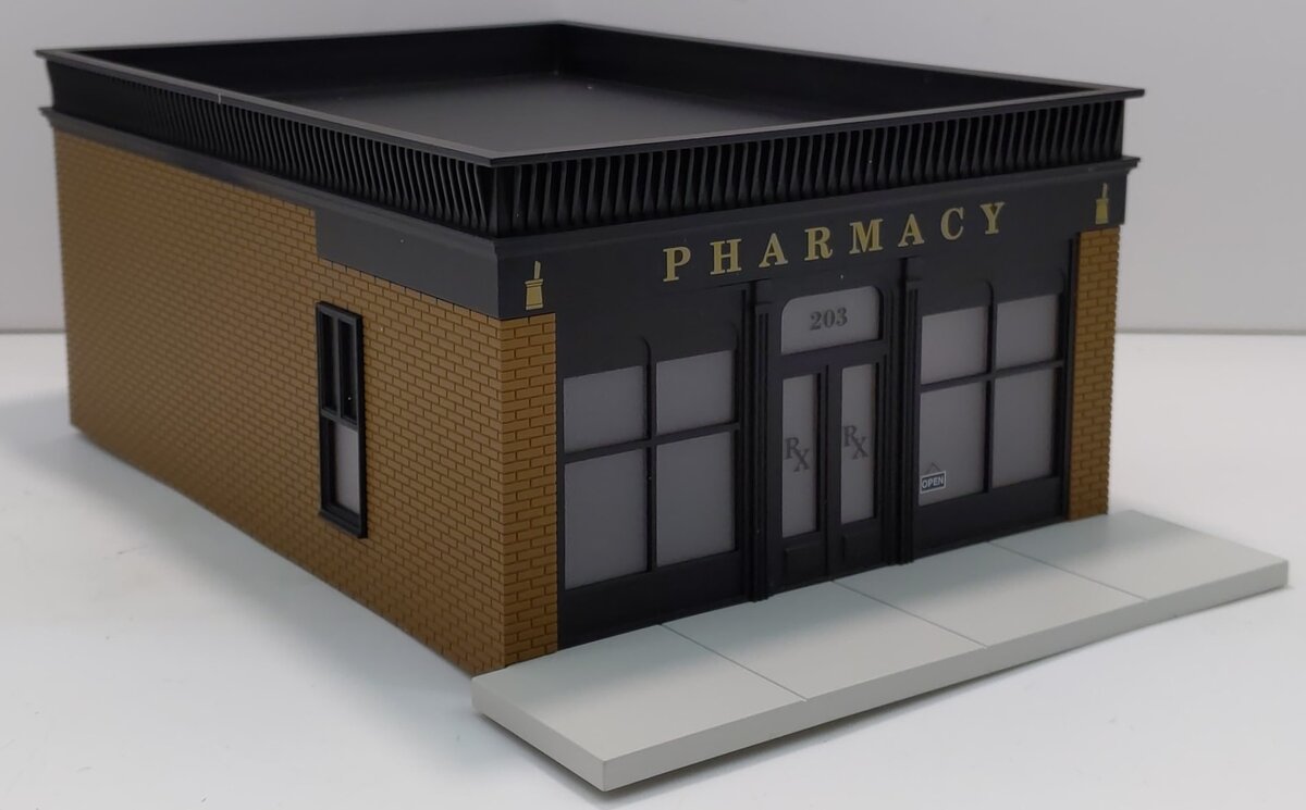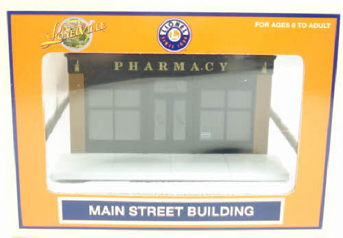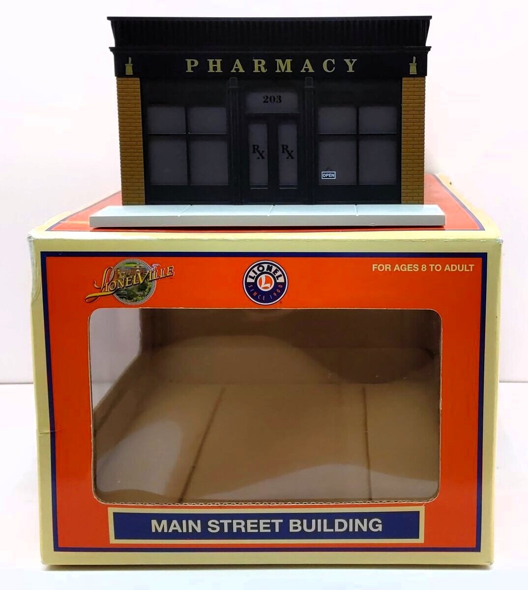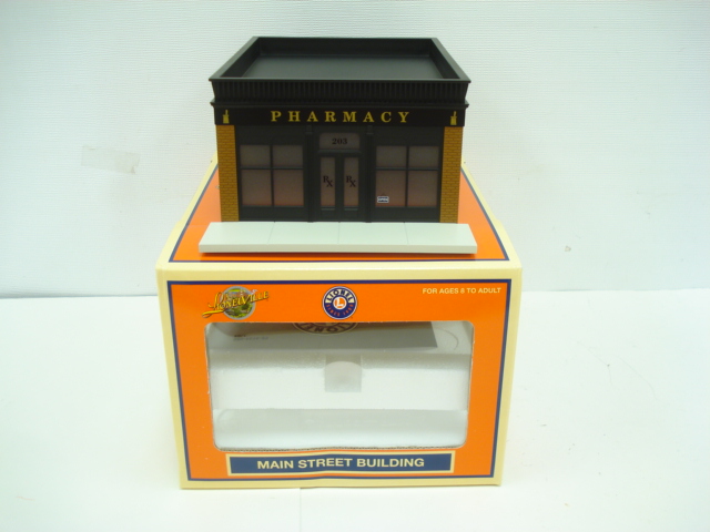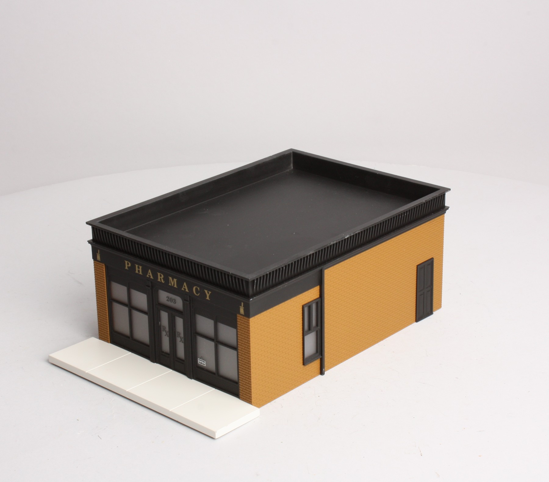 Here is a Lionel 6-34128 O Pharmacy Building. It features a lighted interior and comes fully assembled! It measures approximately 9" x 4".