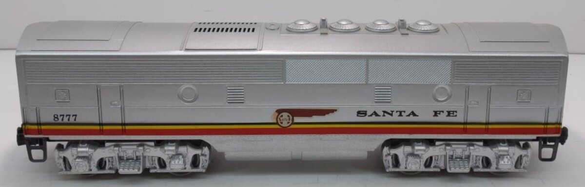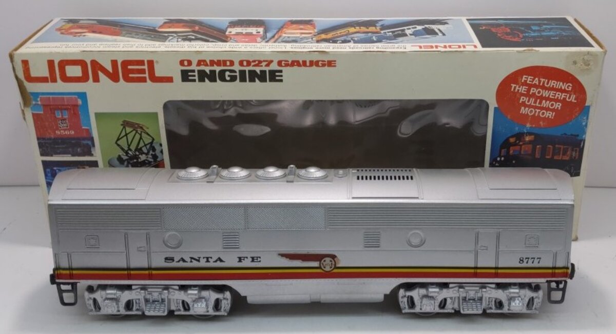 Here is a Lionel 6-8777 O Gauge Santa Fe F3 B Unit Non-Powered Diesel Locomotive. It does not have any sounds or electronics. It matches the Lionel 8652 and 8653 Santa Fe F3 AA Diesels from 1976-1977. This car features die-cast metal trucks, knuckle couplers, metal wheels and axles.