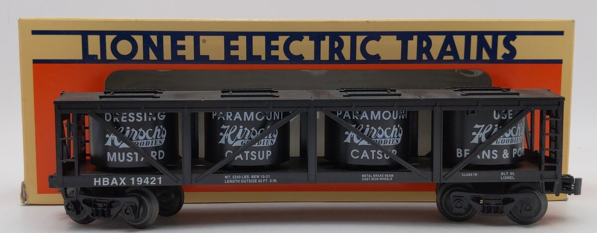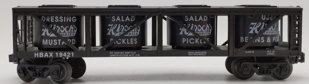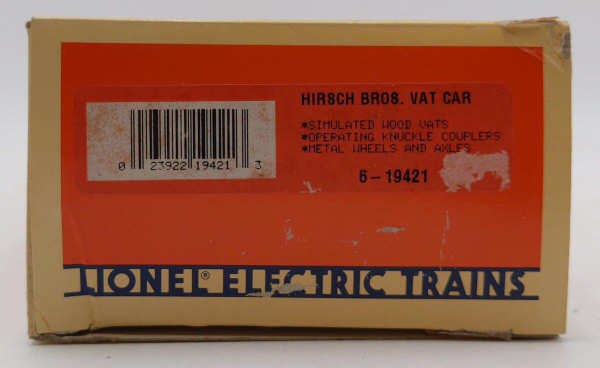 Here is a Lionel 6-19421 O Gauge Hirsch's Brothers Vat Car from 1995. This freight car features a durable plastic construction with plastic trucks, metal wheels and axles, and operating knuckle couplers.