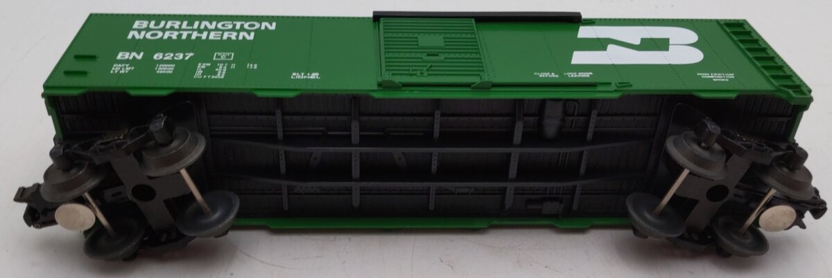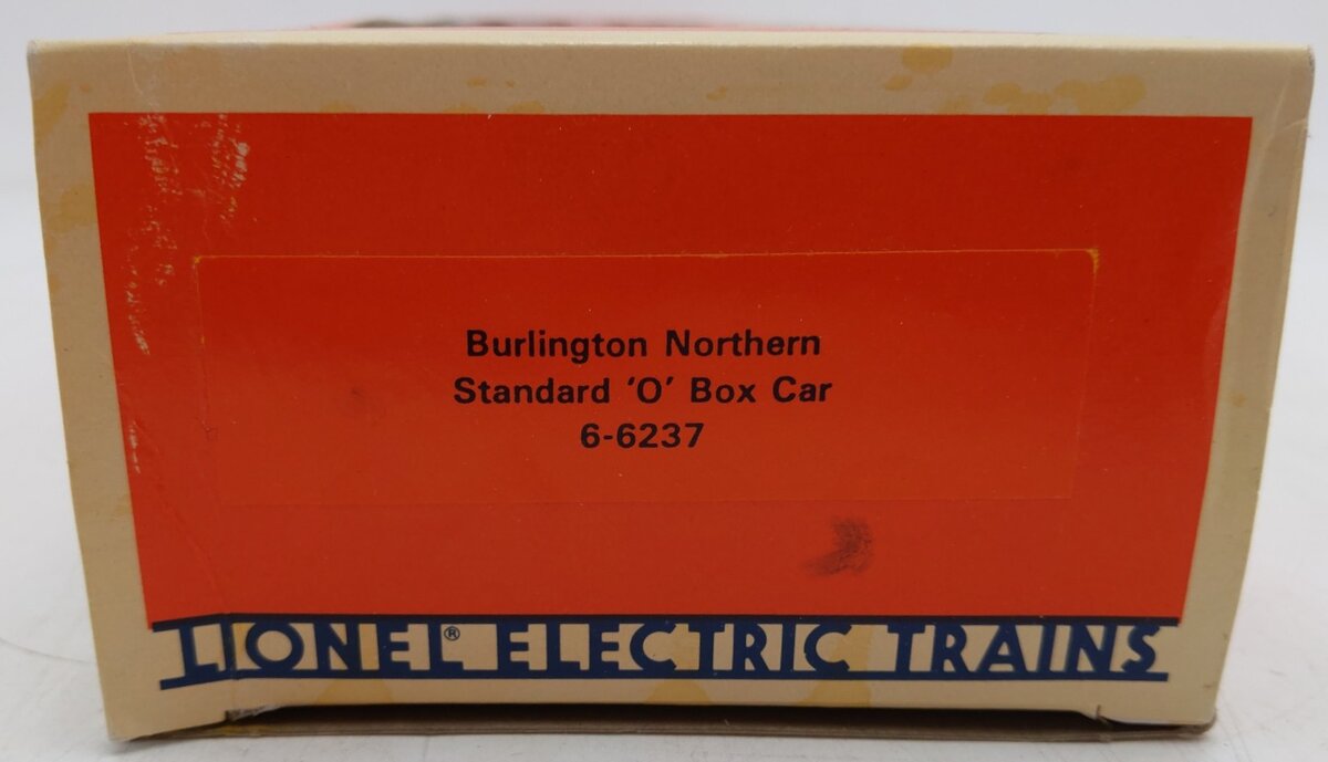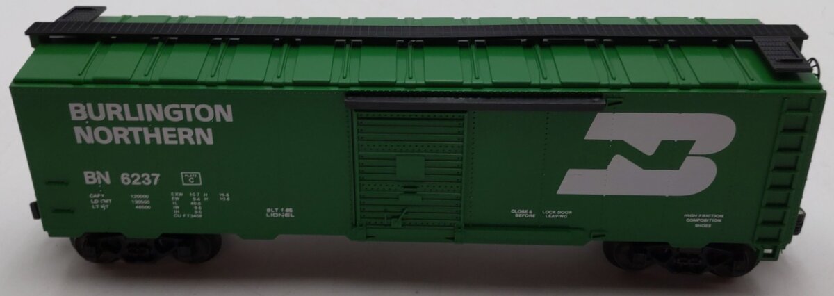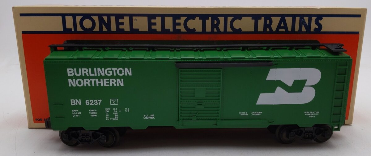 Here is a niceLionel 6-6237 O Gauge Burlington Northern Standard Box Car. This car is from the Burlington Northern Unit Train set of 1985. This car features die-cast sprung trucks and operating couplers as well as sliding doors, a detailed underframe with molded brake system and metal wheels and axles. Road number 6237. It measures approximately 10 1/2" long.