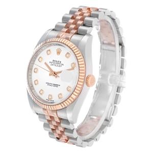 Stainless steel case 36.0 mm in diameter. Rolex logo on the 18K rose gold crown. |