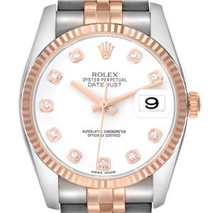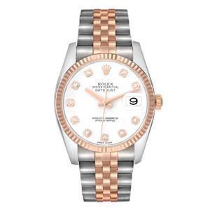 White dial with original Rolex factory diamond hour markers and rose gold hands. Date window at 3 o'clock aperture. |