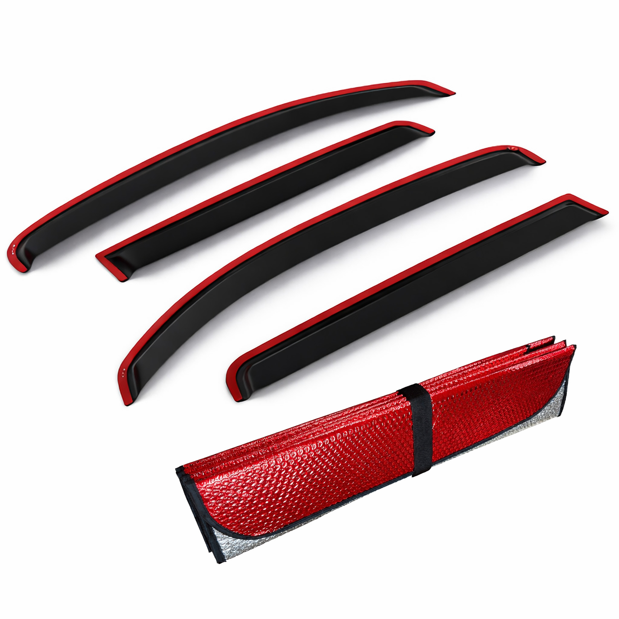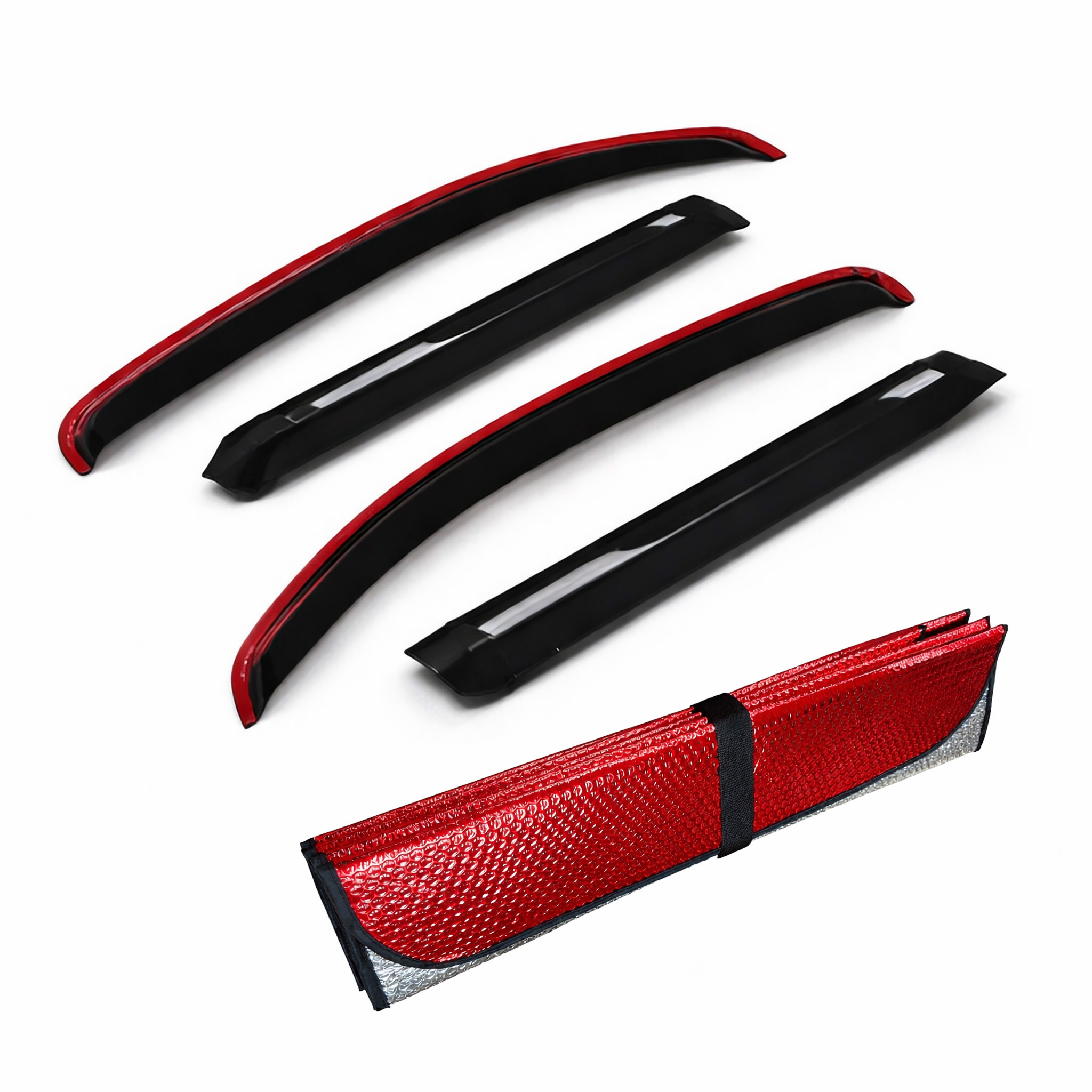 Custom-fit rain guard window visors paired with a foldable sun shade, designed specifically for compatible vehicles. The dark smoke visor helps reduce interior heat buildup while allowing fresh air circulation during rain or light weather, letting windows remain slightly open for ventilation. The included sun shade helps block sunlight and heat, improving cabin comfort and protecting the interior from UV exposure.