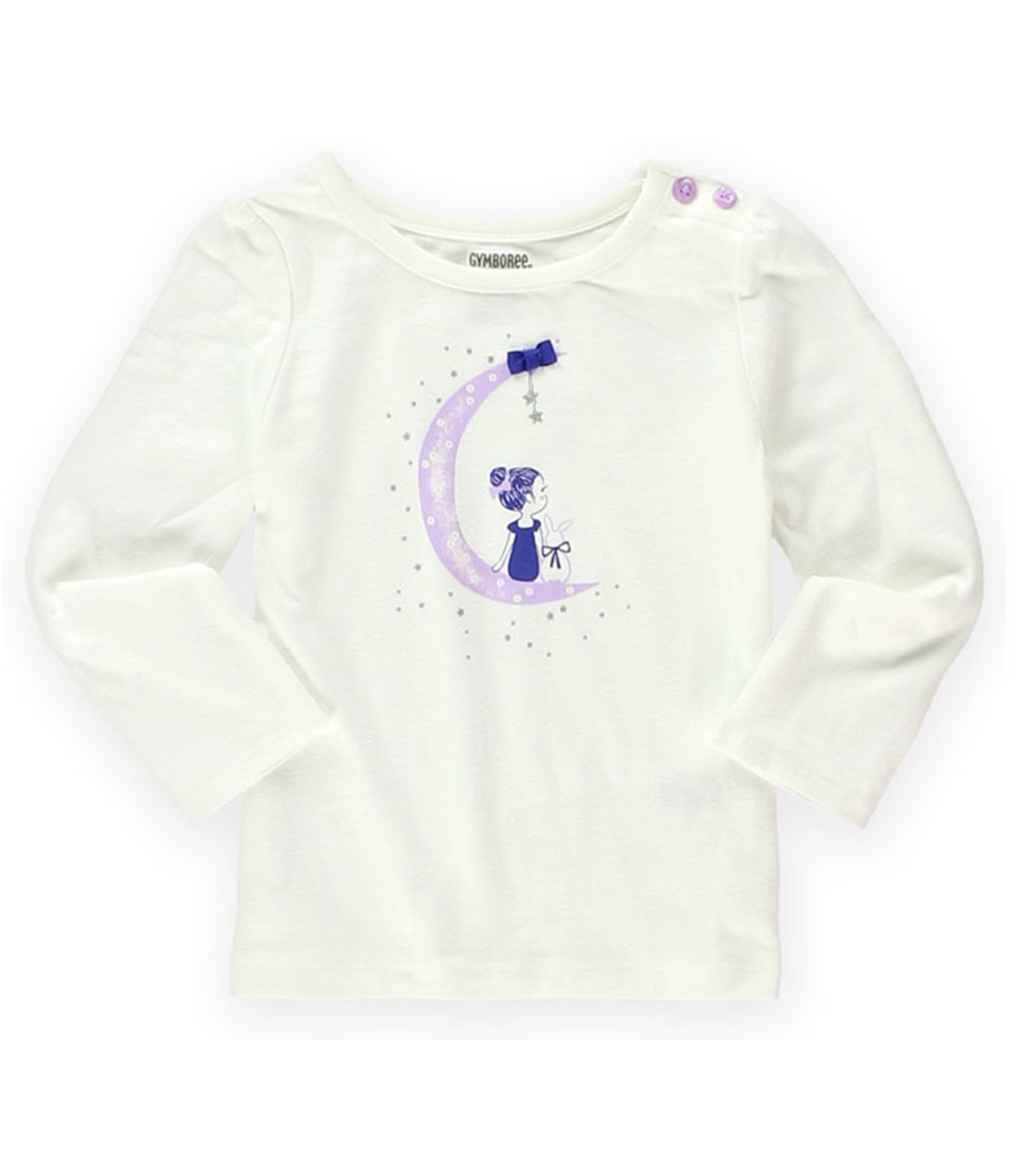 Imagine her gazing at the stars in this enchanting long-sleeve tee. The soft, light-weight material drapes beautifully, offering a comfortable fit for all her adventures. A whimsical graphic adorns the front, featuring a little girl on a crescent moon surrounded by glittering stars and a sweet bow accent. The crew neck design with two button closures at the shoulder ensures easy dressing, while the long sleeves provide just the right amount of coverage.