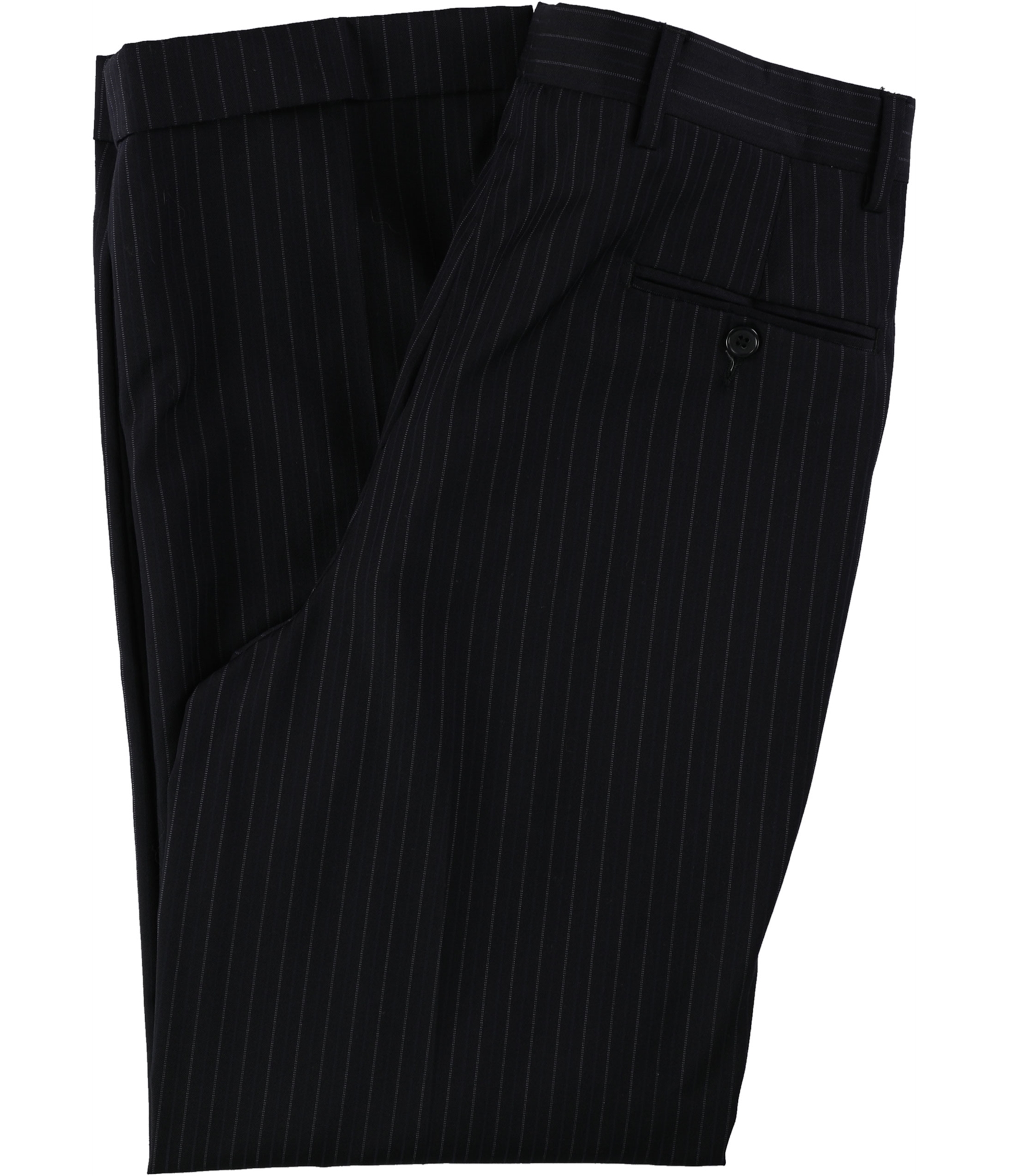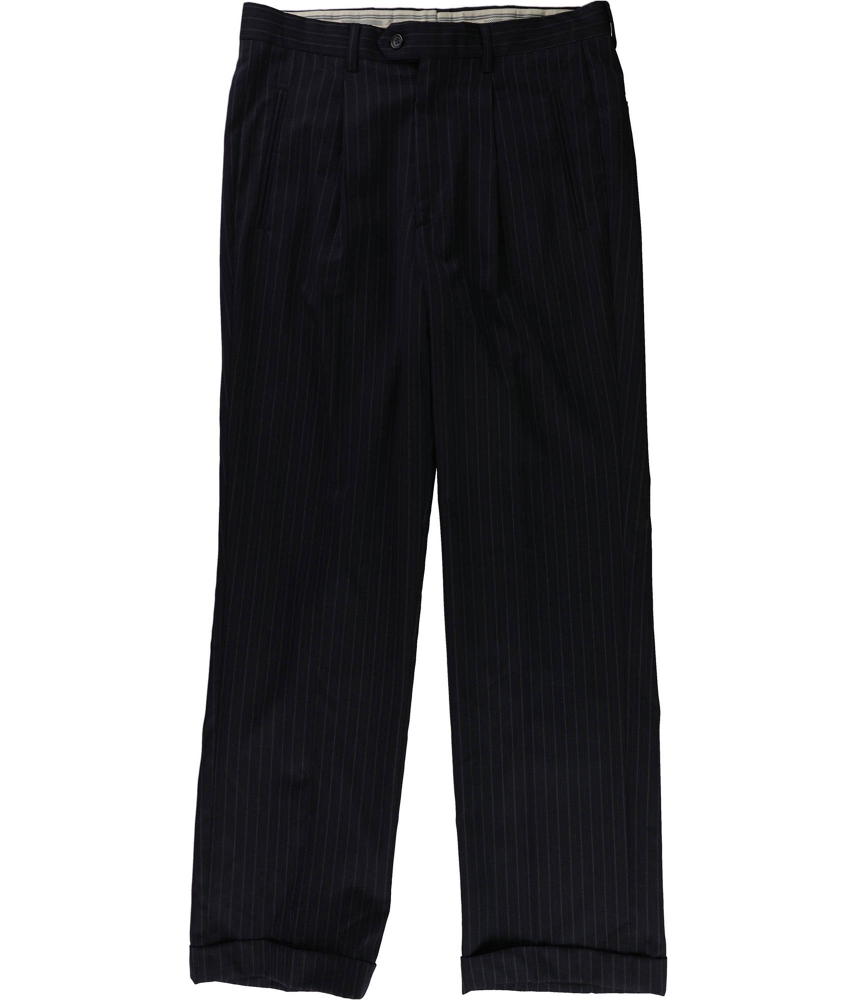 Elevate your professional wardrobe with these impeccably tailored dress pants. Crafted with a classic-rise and a medium-weight feel, they offer a distinguished silhouette perfect for the modern professional. The subtle, three-tone pinstripe pattern adds a touch of timeless sophistication, while the pleated front and full-length cut ensure a sharp and polished appearance. Designed for versatility, these slacks feature a secure zippered closure, accented with buttons, and a practical four-pocket design for your essentials. Whether you're presenting in the boardroom or heading to an important client meeting, these pants exude confidence and refined style.