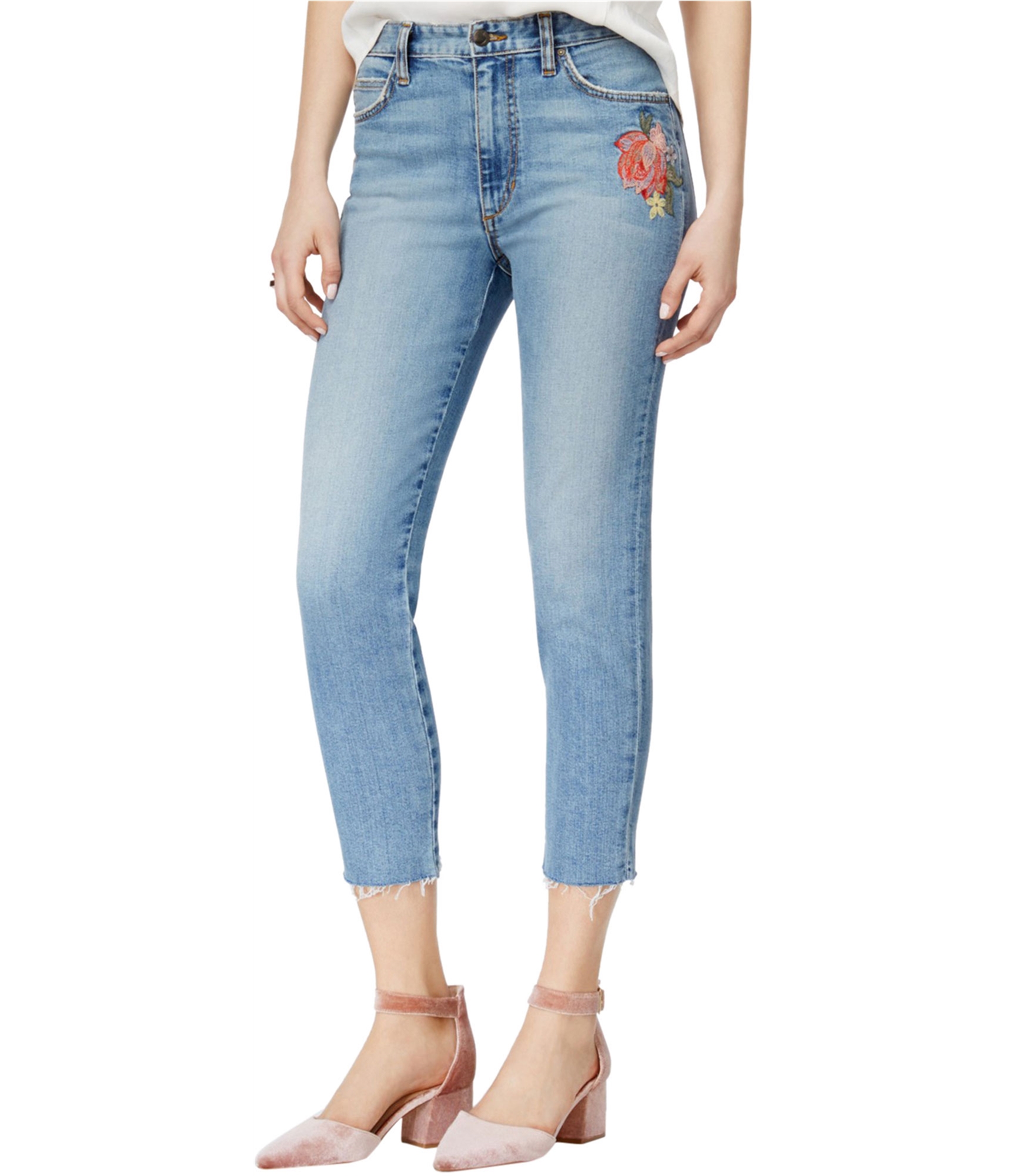 These medium-weight denim jeans are crafted with a classic-rise, skinny-fit silhouette that flatters every curve. The front features a zip-fly and button closure for a secure fit, complemented by belt loops for customizable styling. A faded whiskering effect adds a touch of lived-in charm, while the super-light distressing and frayed cuffs lend a modern, edgy vibe. The standout detail of these jeans is the intricate floral embroidery adorning the side, adding a vibrant pop of color and artistry to your look. They're designed for ultimate comfort and a flawless fit, promising to become your new favorite go-to denim.