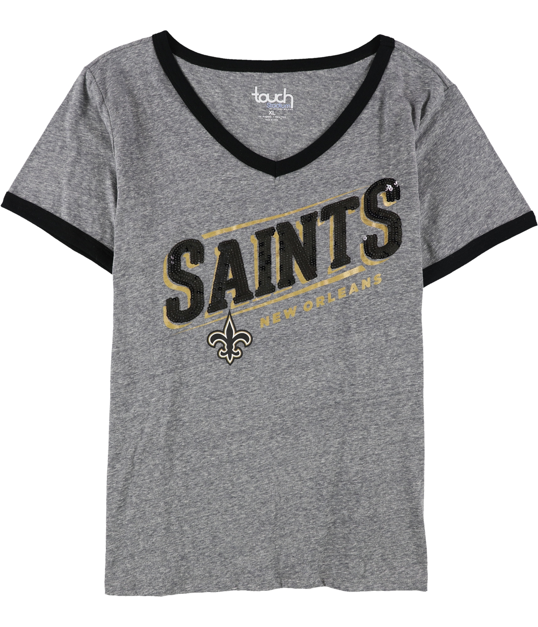 Turn heads on game day with this dazzling New Orleans Saints tee. The classic V-neck silhouette gets a glamorous update with sparkling sequin embellishments that spell out "SAINTS" across the chest. A bold gold outline surrounds the sequins, making the team name pop, while the iconic fleur-de-lis emblem sits proudly below. Contrasting black trim on the neckline and sleeves adds a sporty, yet refined, detail. This shirt is perfect for showing your team spirit in style, whether you're cheering from the stadium or watching the game with friends.