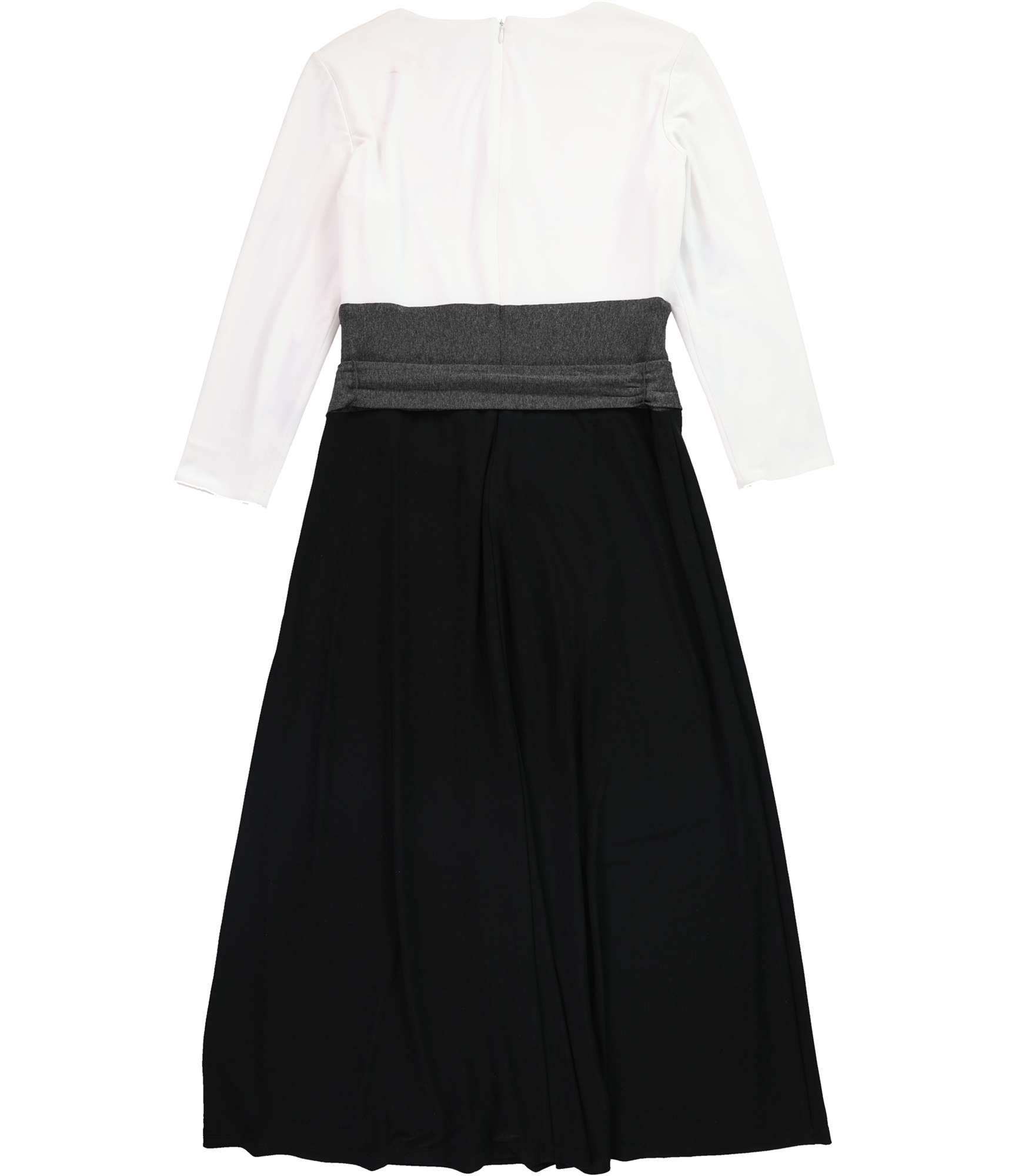 MODERN PANEL CONSTRUCTION: Midi dress features a color-blocked design with a white top and black skirt, cinched by a grey ribbed belt, offering a contemporary and flattering silhouette.
