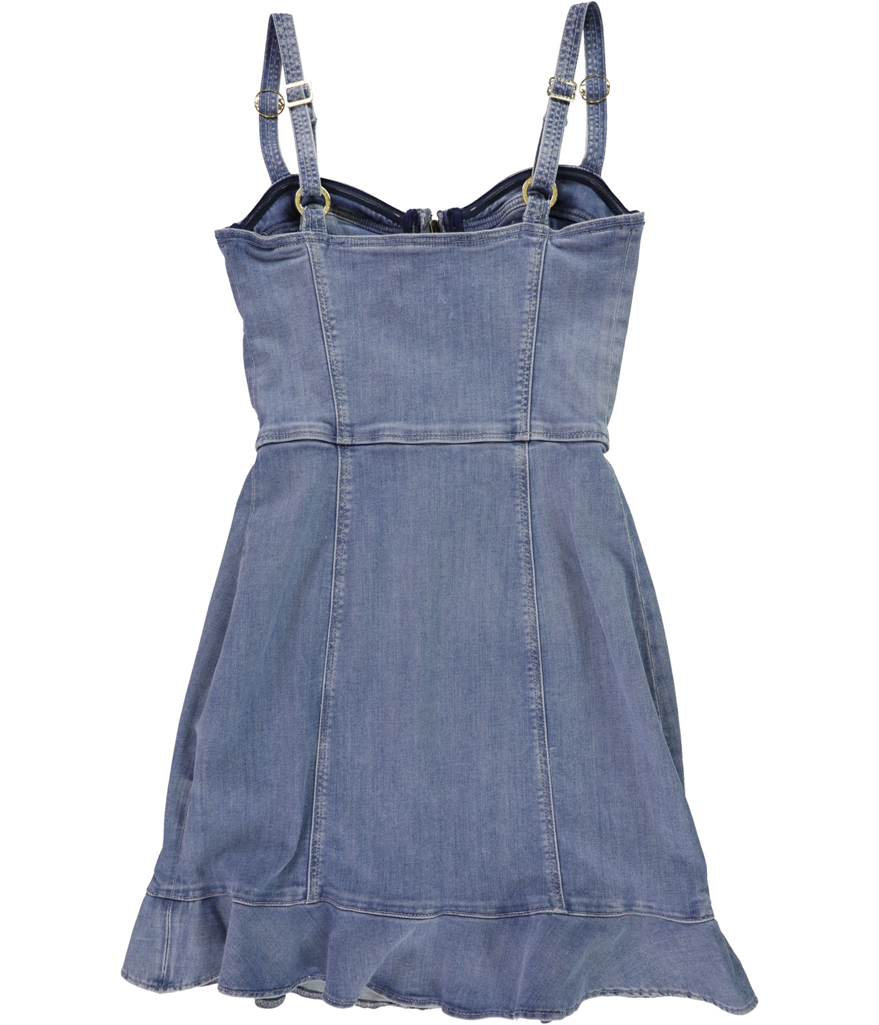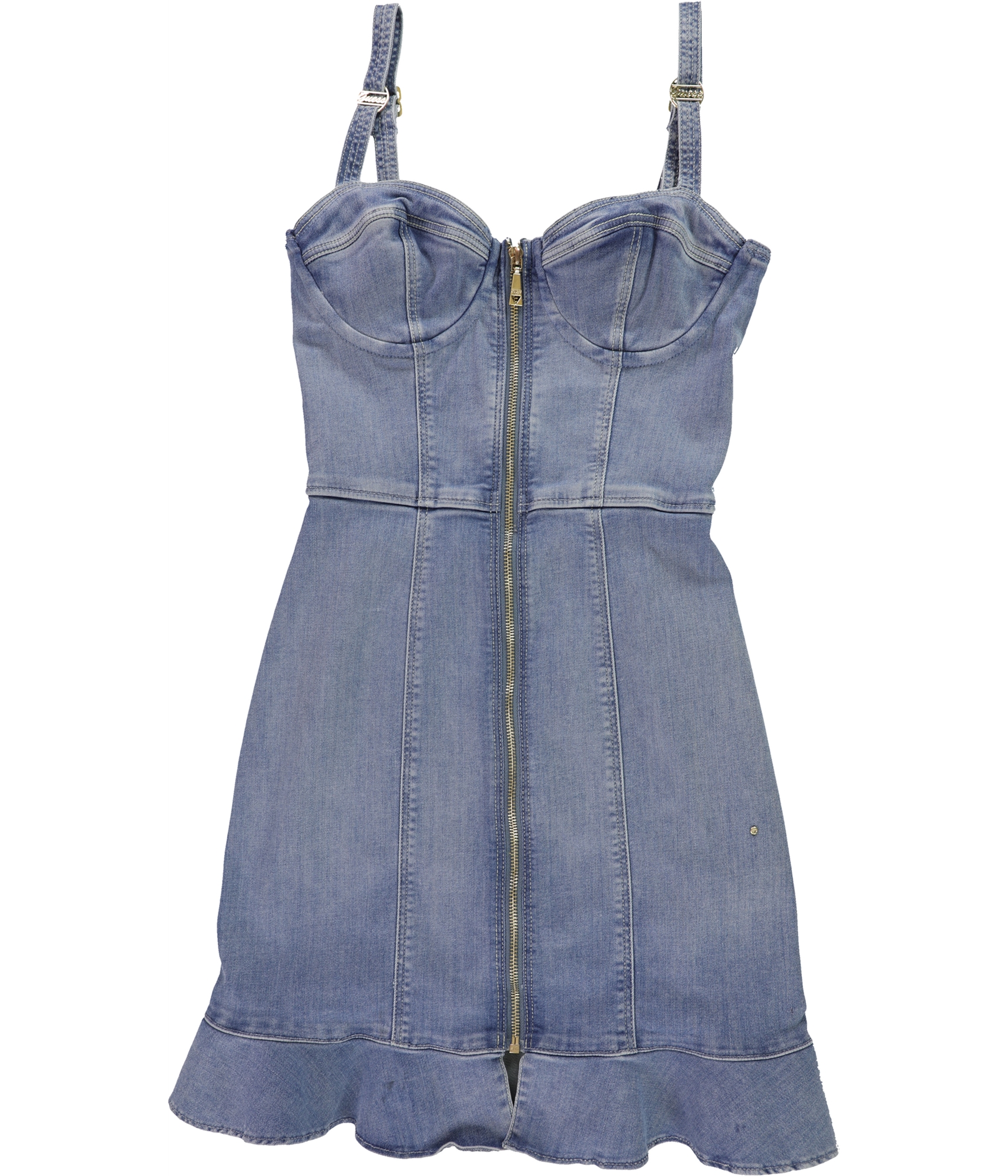 This GUESS denim bustier dress features a sweetheart neckline and adjustable spaghetti straps, perfect for a night out or a casual day event. The structured bodice is designed to flatter your figure, while the front zipper closure adds a touch of modern edge. The mini length is complemented by a playful ruffled hemline, giving it a flirty and fashionable finish that moves beautifully with you. It's a versatile piece that embodies confidence and style, ready for any occasion you choose to wear it.