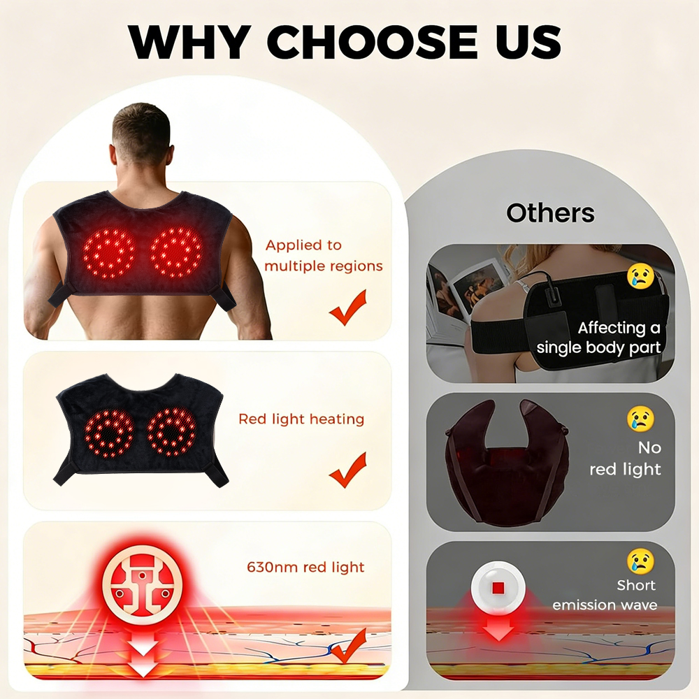 All-Around Comfort Design: With dimensions of 10.62×15.74 inch, this red light therapy wrap covers not only the shoulders but also the back, delivering an all-round therapeutic experience. Its ergonomic cut adapts perfectly to the body’s natural contours, ensuring a soft and snug fit that won’t feel restrictive even during prolonged use. Whether you’re sitting, standing, or lying down, the wrap stays in place, allowing the therapeutic light to fully reach the target areas for optimal effects.