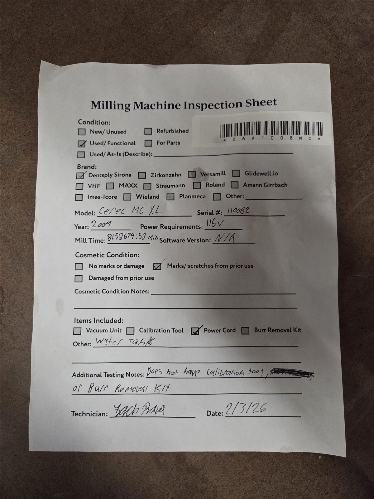MARKS & SCRATCHES N/A Specifications Manufacturer: Sirona Model: CEREC MC XL Power Requirements: 115V Year: 2009