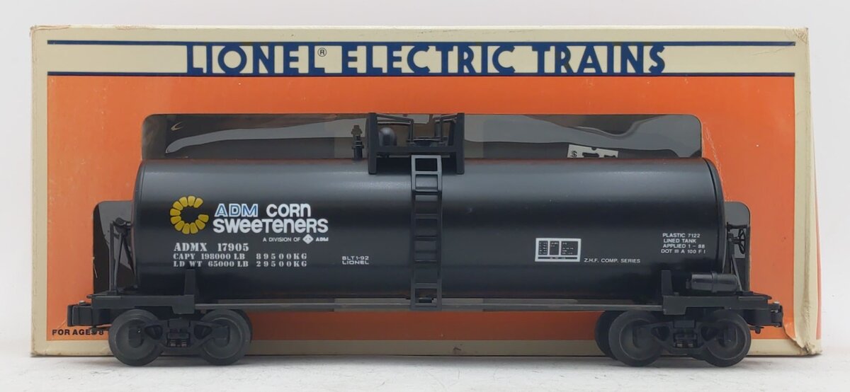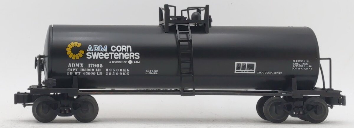 Here is a Lionel 6-17905 O Gauge Archer Daniels Midland Unibody Tank Car from 1992. This car is scale length and features die cast sprung trucks, metal wheels and axles, and operating knuckle couplers.