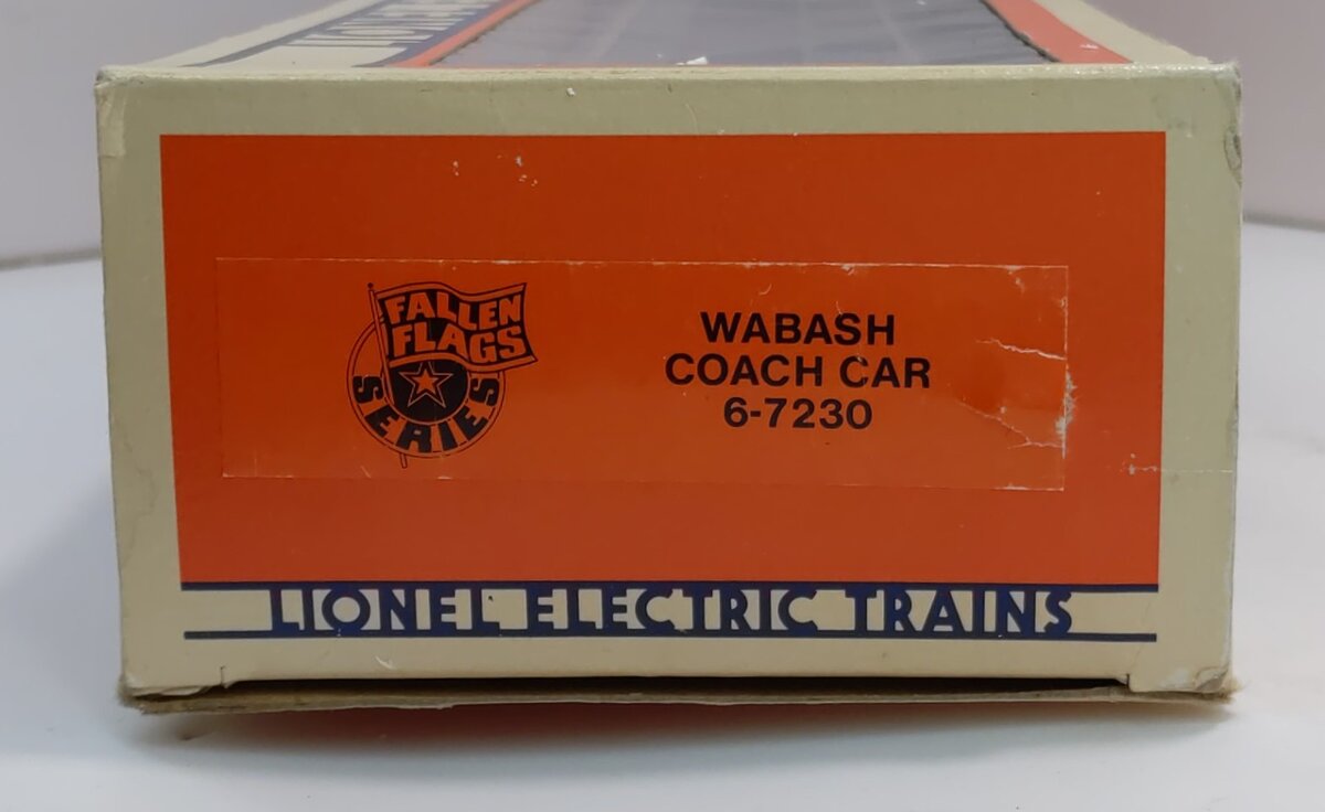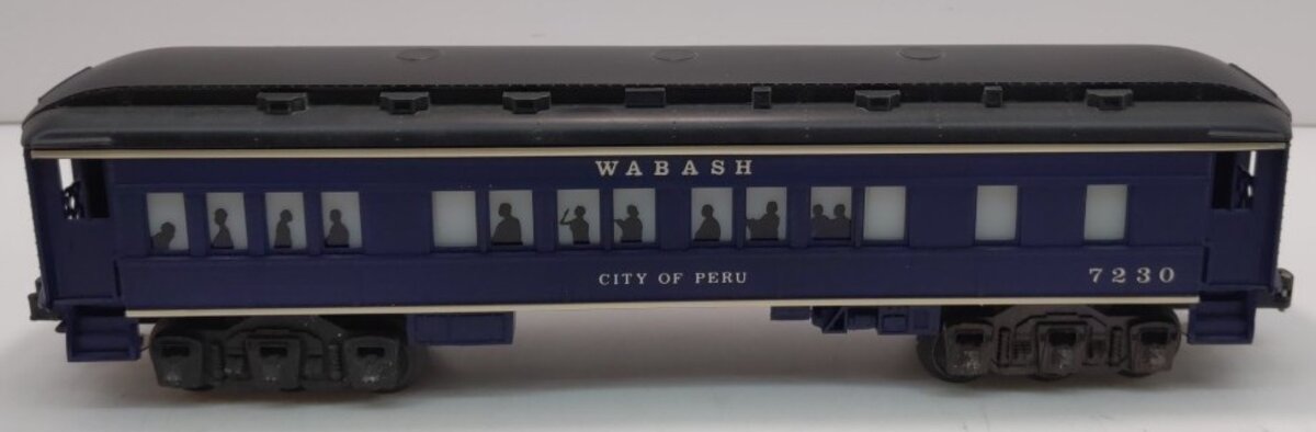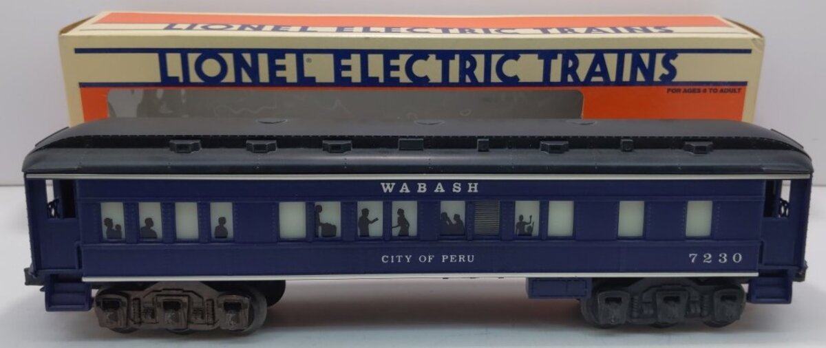 Here is a Lionel 6-7230 O Wabash "City of Peru" Passenger Car #7230 (FF #1). This car is from the Wabash 'Fallen Flags' Set from 1986. It features a plastic body, an illuminated interior with passenger silhouetted windows, die-cast 6-wheel trucks with operating metal couplers, and it is 12 inches long. This was the only passenger train in the Fallen Flags series. The full set includes the 8610 Wabash 4-6-2 Steam Locomotive and the 7227-7232 Passenger Cars.