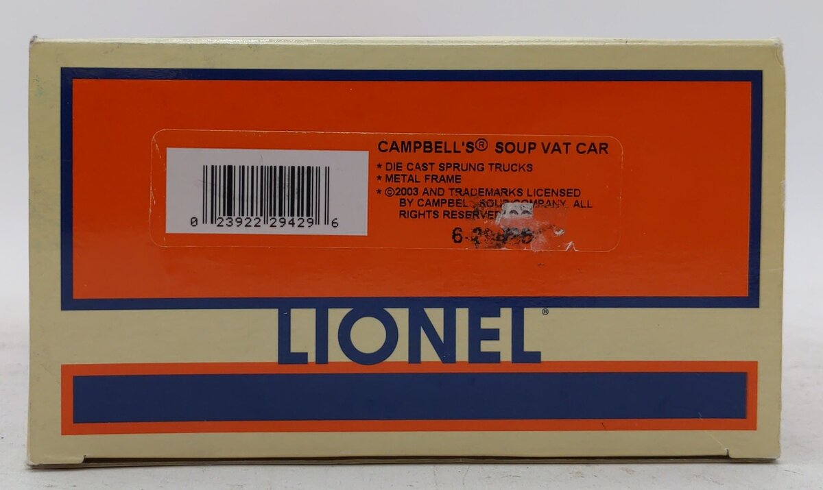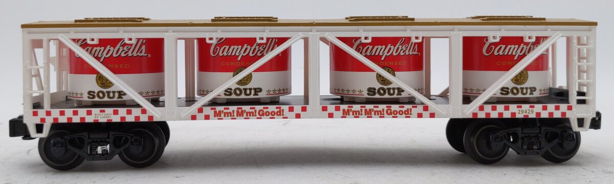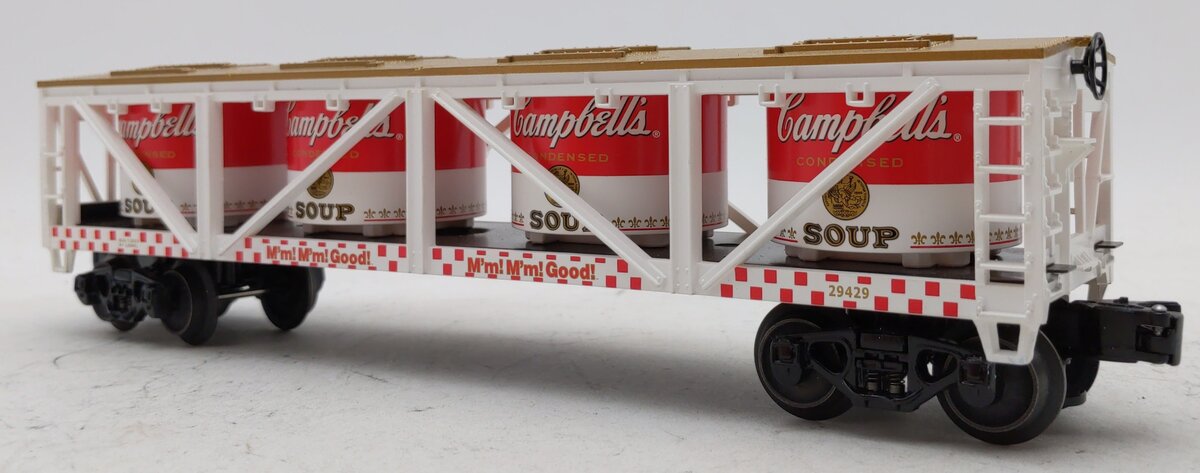 Here is a 29429 Campbell's Soup Vat Car. This car features a die-cast frame, die-cast metal sprung trucks, die-cast metal operating knuckle couplers, and metal wheels and axles.