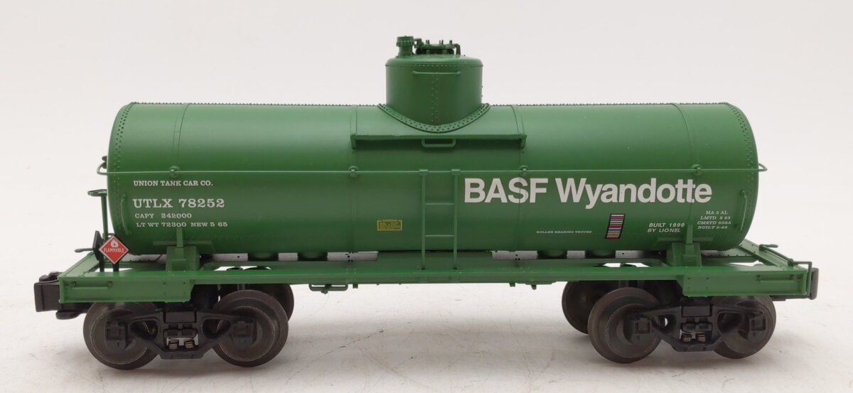 Here is a Lionel 6-19614 O Gauge BASF 8,000 Gallon Tank Car #78252 from 1999. Features include die-cast sprung trucks, magnetic couplers, metal wheels and axles.