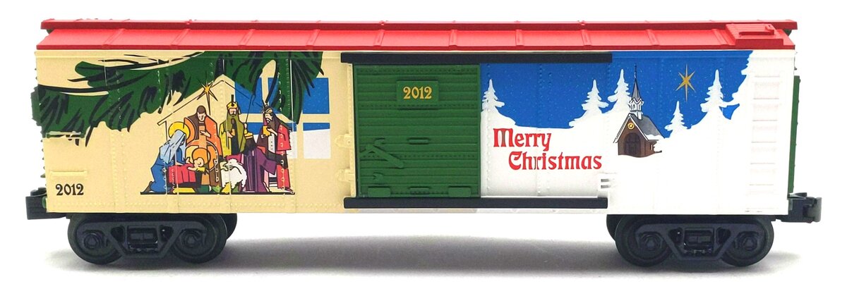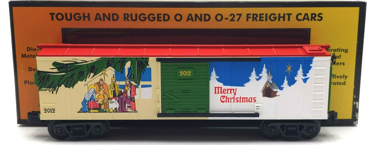 This is a MTH 30-74692 O Gauge 2012 Christmas Box Car. High quality, traditionally sized RailKing Freight Cars provide detailed bodies and colorful paint schemes for the O Gauge railroader. Features include: Intricately Detailed Durable ABS Body, Metal Wheels and Axles, Die-Cast 4-Wheel Trucks, Operating Die-Cast Metal Couplers, Colorful, Attractive Paint Schemes, Decorative Brake Wheels, Separate Metal Handrails, Fast-Angle Wheel Sets, Needle-Point Axles, Unit Measures:11 1/2 x 2 3/8 x 2 5/16, and Operates On O-27 Curves.