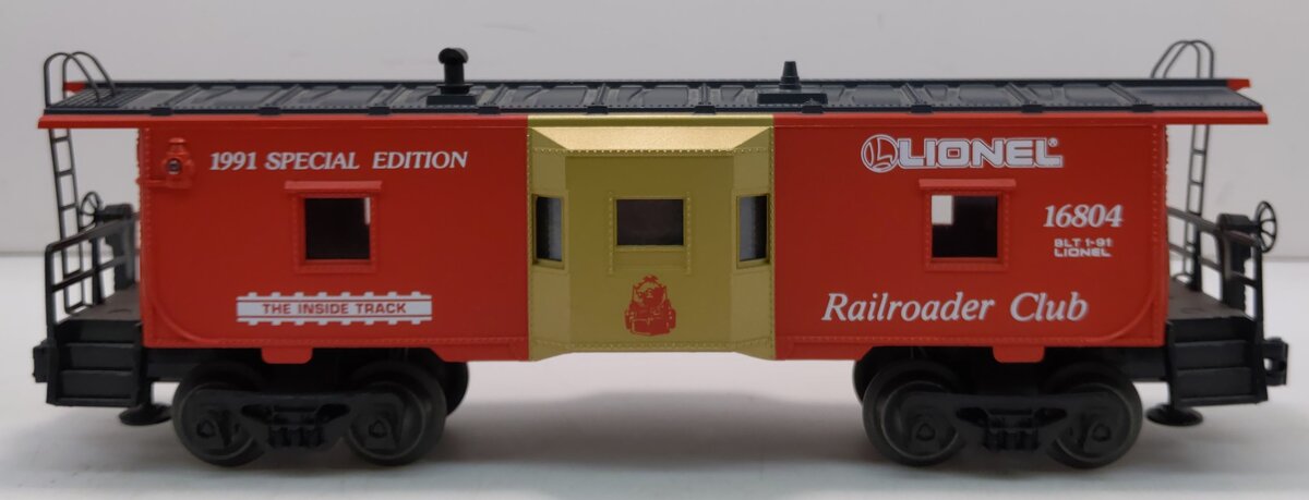 Here is a Lionel 6-16804 O Gauge Lionel Railroader Club Bay Window Caboose #16804. This car is part of a series of cars specially available to members of the Lionel Collectors Club. It is lighted and also features plastic trucks and operating couplers.