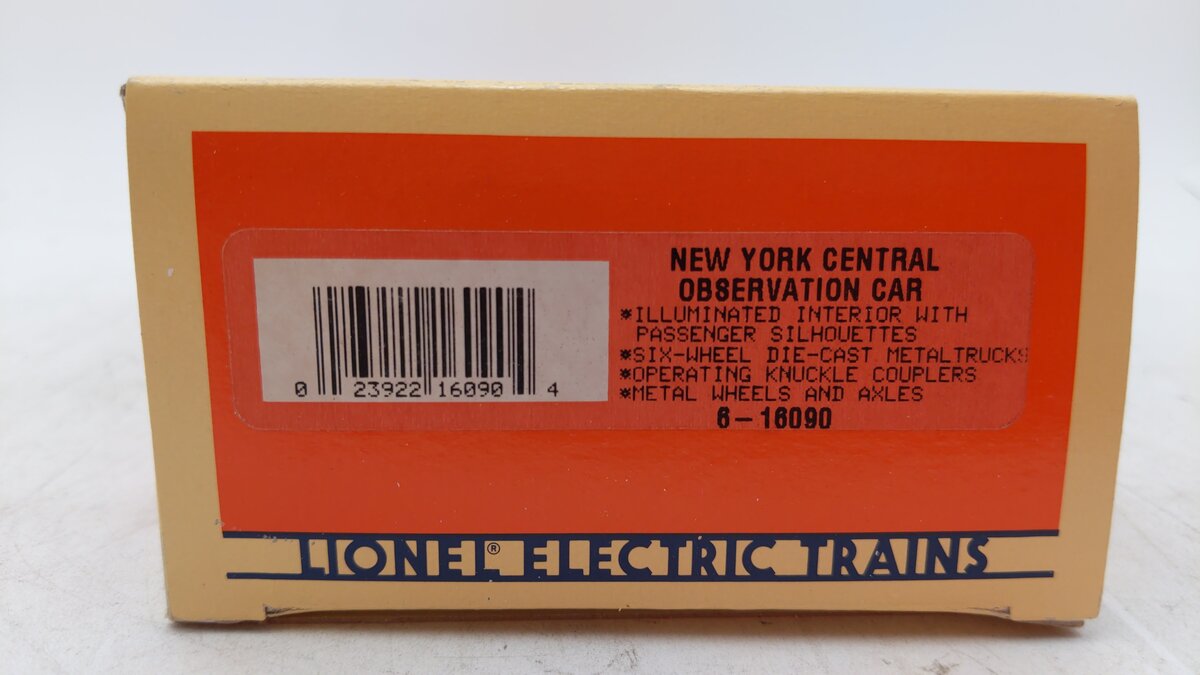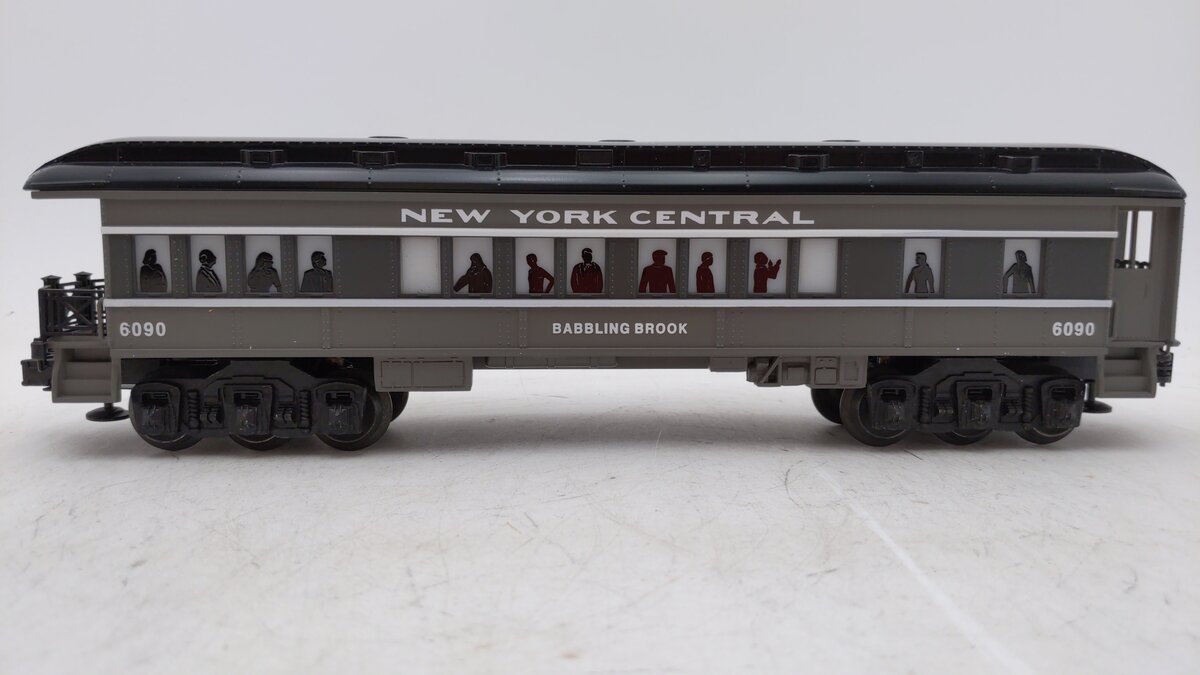 Here is a Lionel 6-16090 O Gauge New York Central "Babbling Brook" Observation Car #6090 from 1995. It features a durable plastic body, an illuminated interior with passenger silhouetted windows, plastic trucks with operating die cast couplers, and it is 12 inches long.