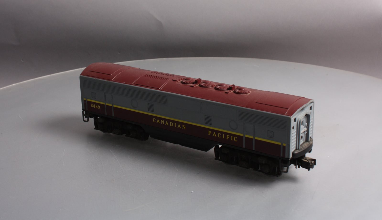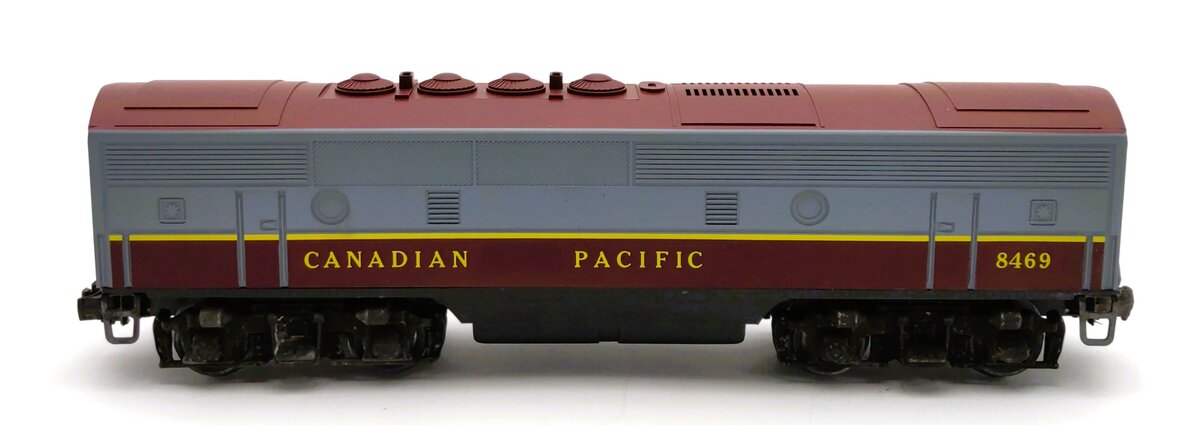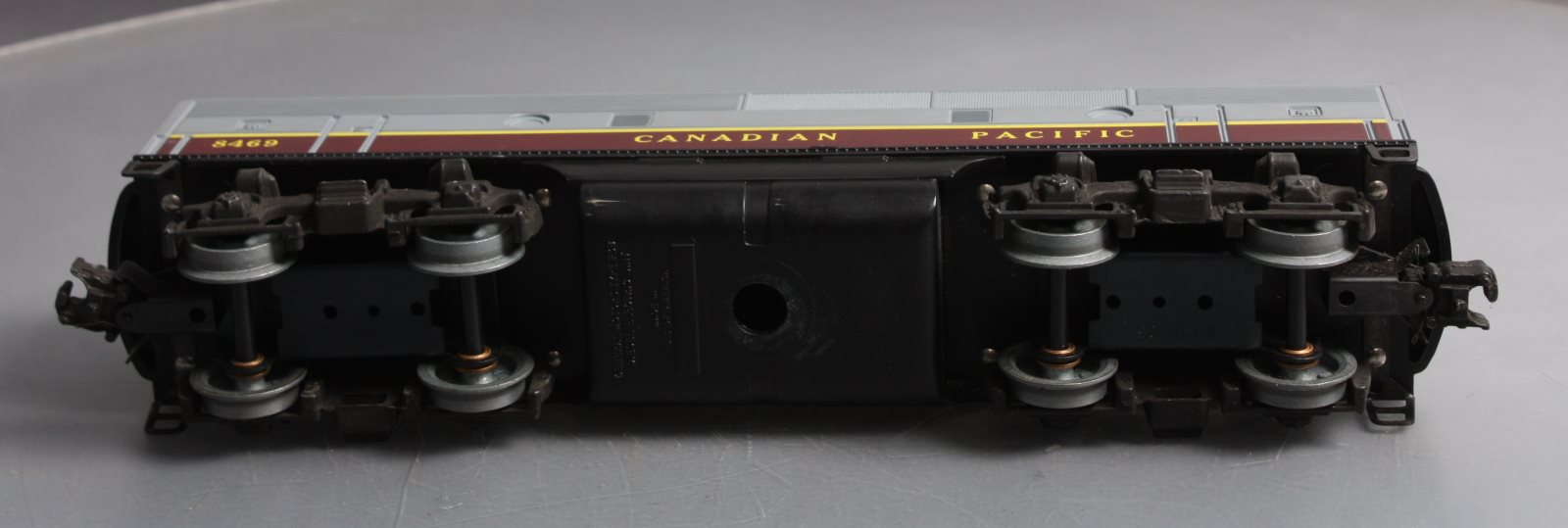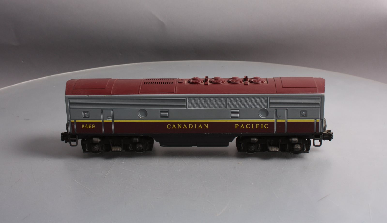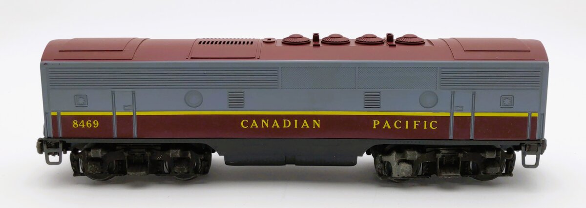 Here is a Lionel 6-8469 O Gauge Canadian Pacific F3 B-Unit Non-Powered Diesel Locomotive from 1974. It has fixed couplers on both ends, detailed die-cast trucks, and metal wheels and axles. This is an add-on to the 1350 Canadian Pacific Service Station Special Set and matches the 8365 and 8366 F3 Diesels.