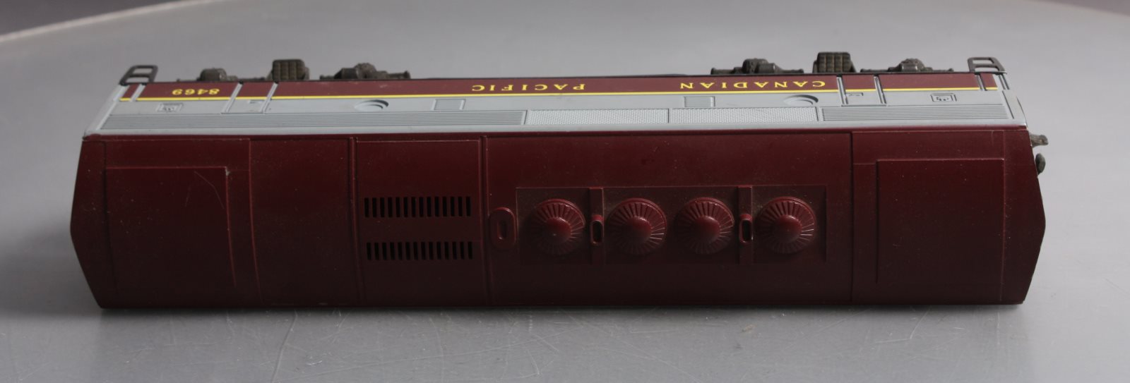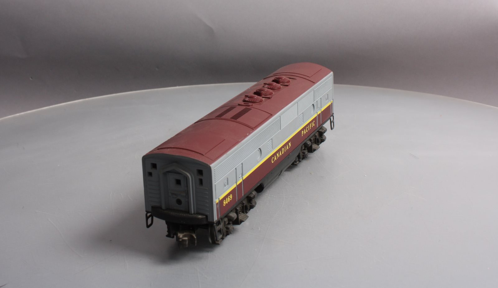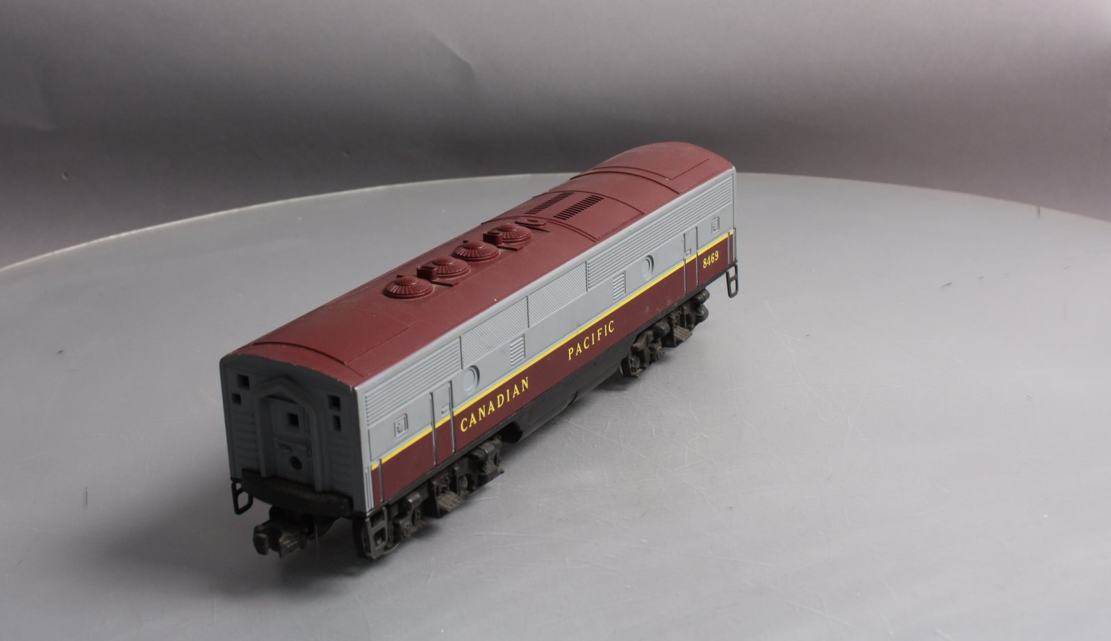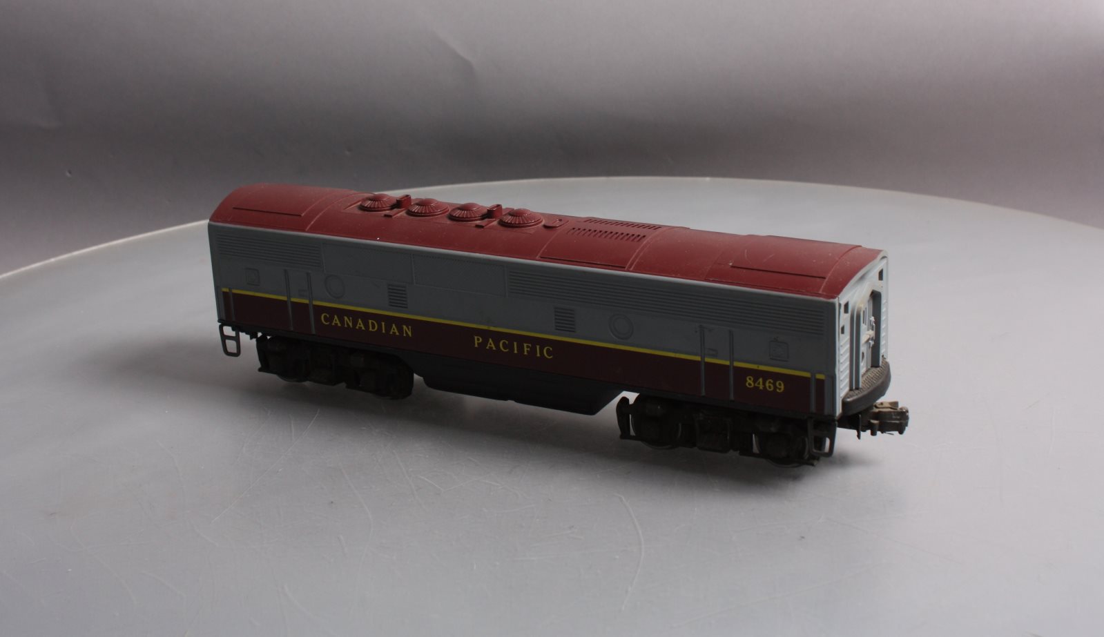 Here is a Lionel 6-8469 O Gauge Canadian Pacific F3 B-Unit Non-Powered Diesel Locomotive from 1974. It has fixed couplers on both ends, detailed die-cast trucks, and metal wheels and axles. This is an add-on to the 1350 Canadian Pacific Service Station Special Set and matches the 8365 and 8366 F3 Diesels.